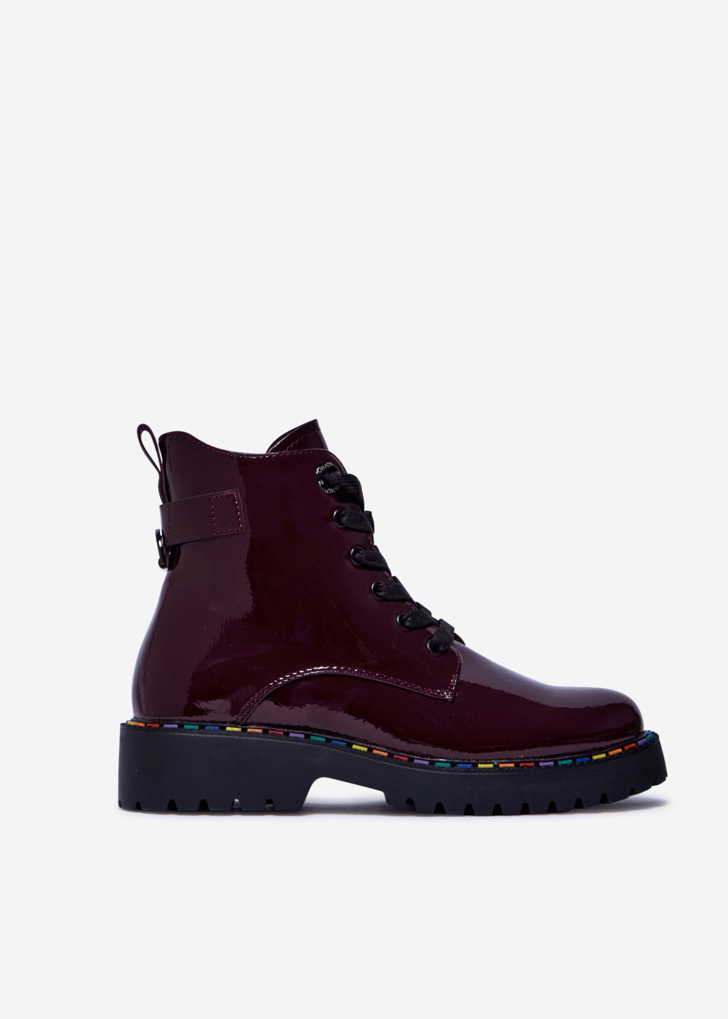 Step into bold style with these black patent combat boots featuring a glossy finish and chunky sole for all-day comfort. Designed with lace-up fastening, side zipper for easy wear, and unique rainbow stitching along the sole, these boots add a playful twist to a classic edgy look. Perfect for pairing with jeans, dresses, or oversized coats, they’re the ultimate versatile boots to refresh your wardrobe this season.