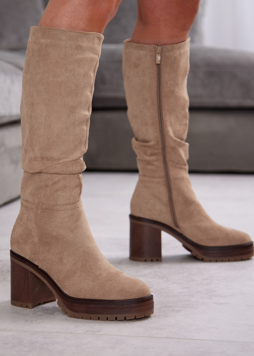 Refresh your wardrobe with these chic khaki suede knee-high boots. Designed with a sturdy block heel and platform sole, they provide both style and comfort for everyday wear. The soft suede finish gives them an elegant touch, while the side zip fastening makes them easy to slip on and off. Their versatile khaki shade pairs beautifully with neutral tones, coats, and layered outfits, making them a must-have for autumn and winter styling. Perfect for women looking to balance trendiness with practicality.