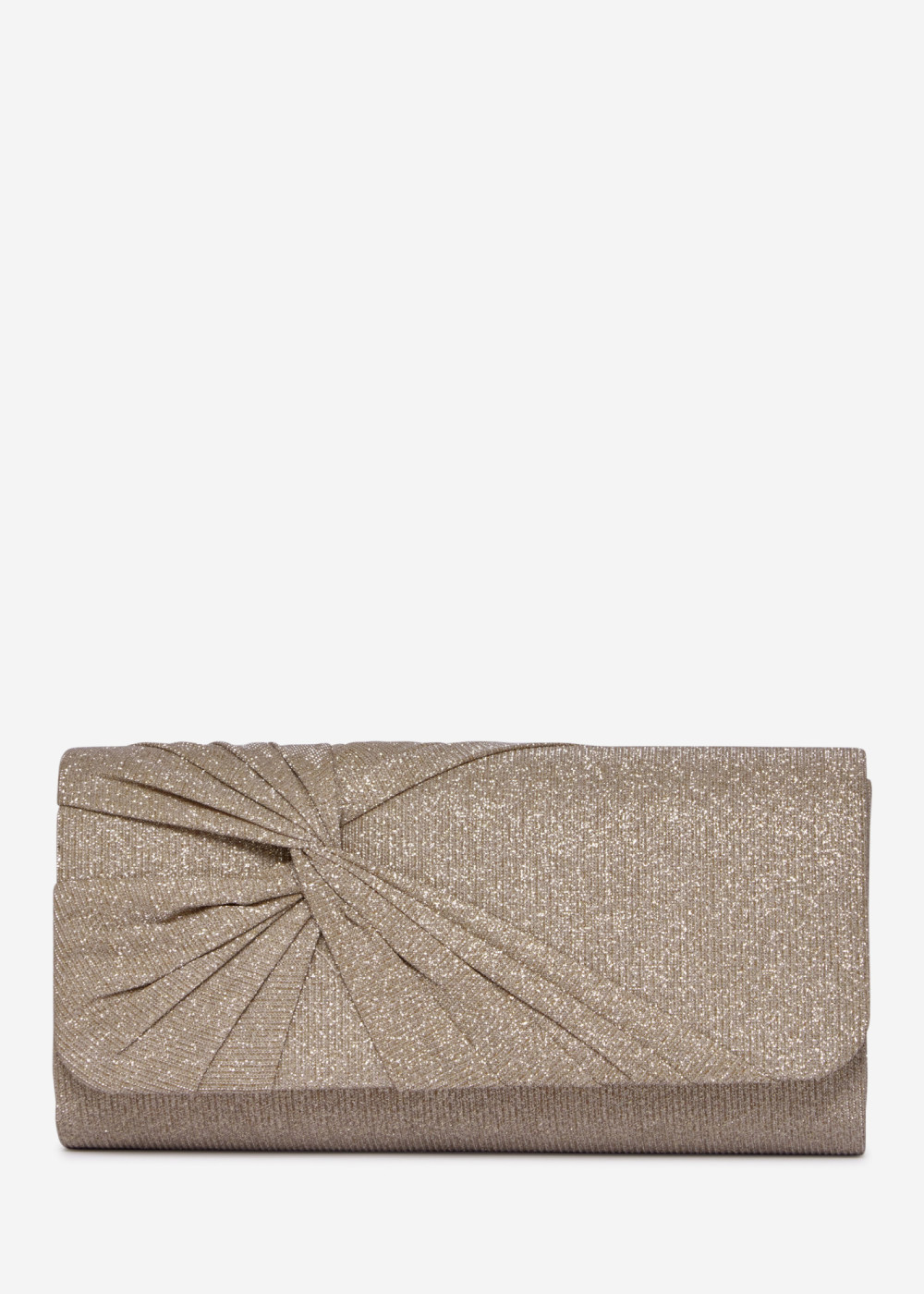 Turn every occasion into a glamorous affair with our Gold Glitter Pleated Evening Clutch Bag with Chain. Designed in shimmering gold fabric with a soft pleated twist detail, this elegant clutch exudes timeless sophistication and charm.