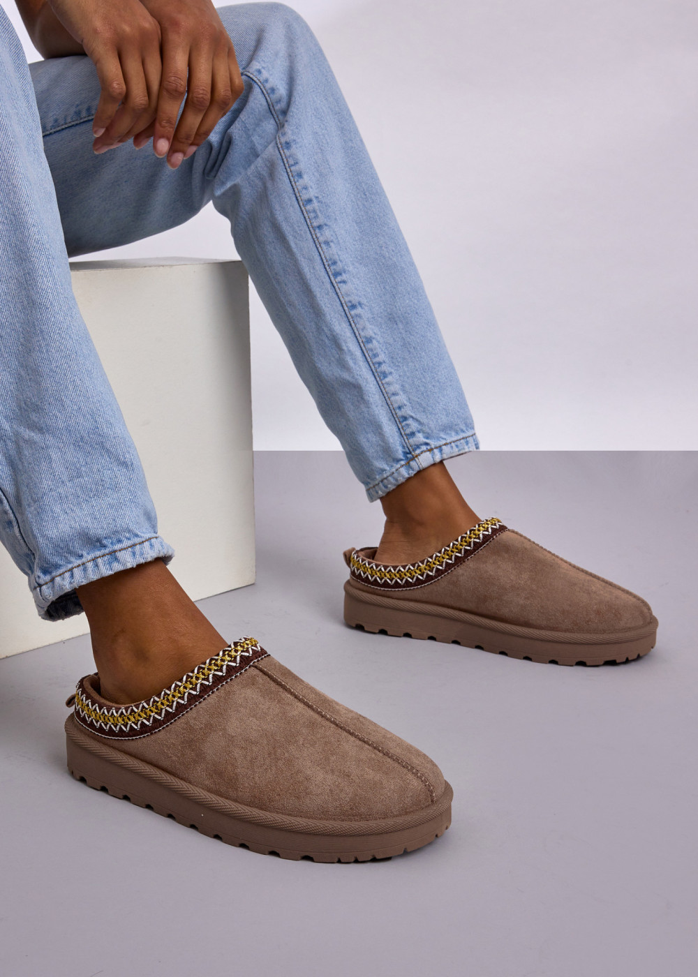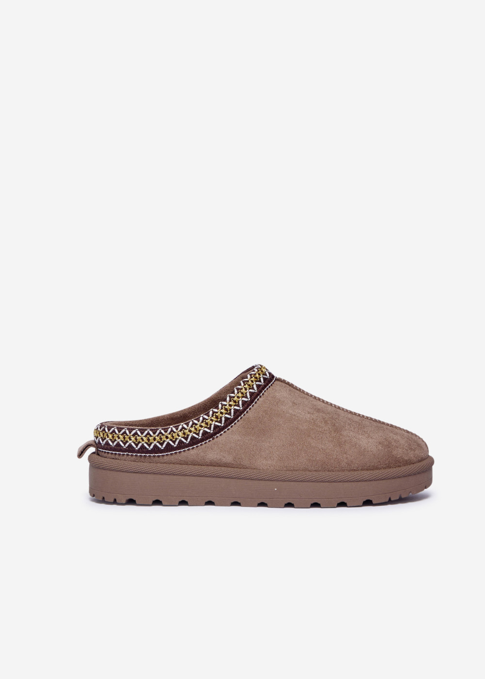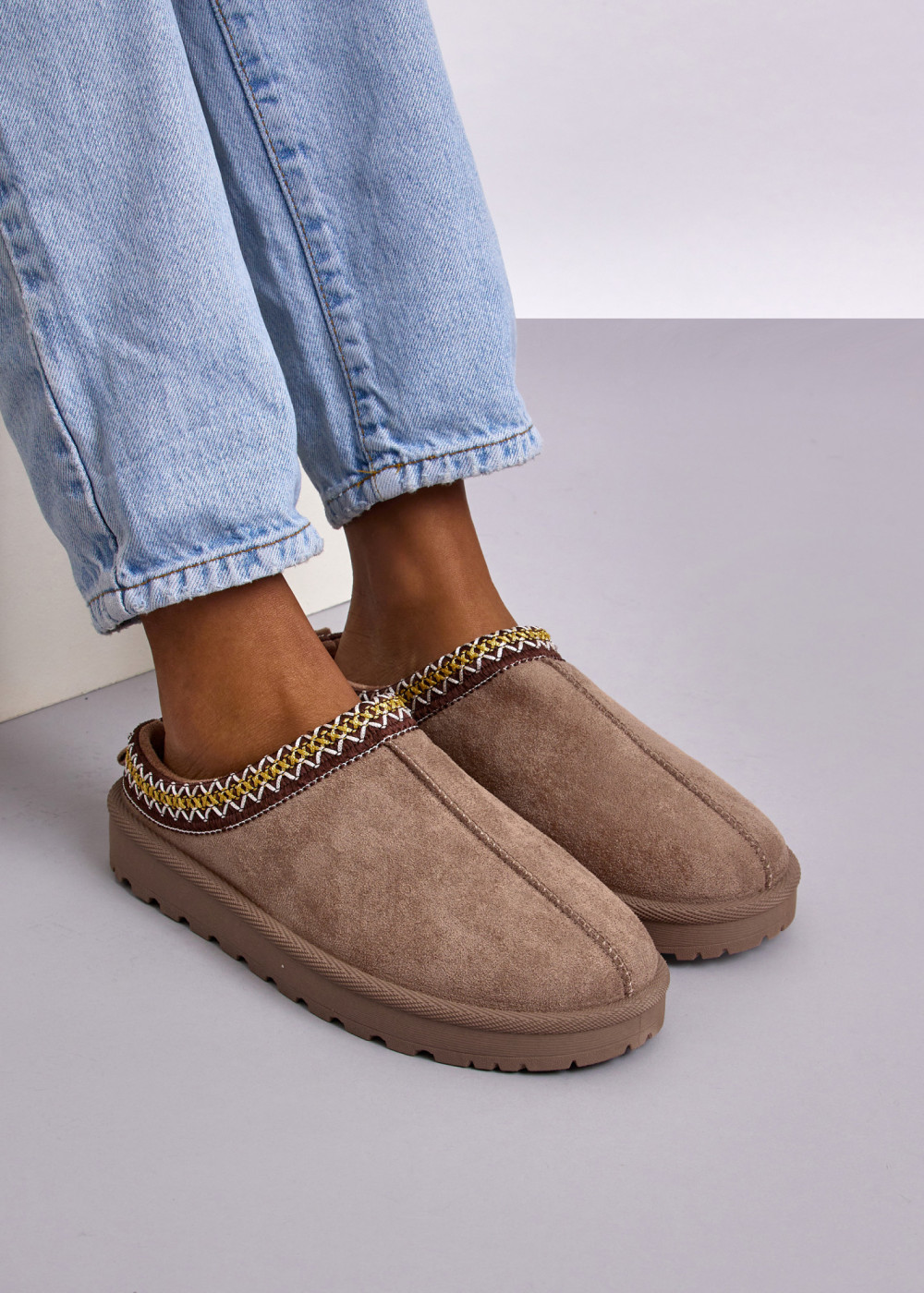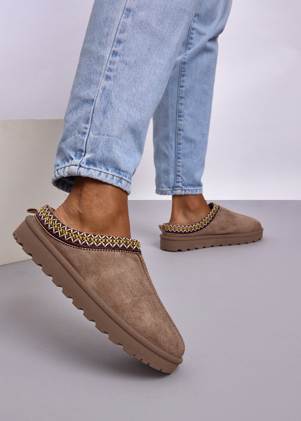 Experience the perfect blend of cosy comfort and everyday practicality with our Khaki Faux Suede Winter Mules with Decorative Trim. Crafted from soft faux suede, these slip-on mules feature a warm inner lining that keeps your feet snug during colder days. The beautifully woven decorative trim adds a stylish finish, giving the shoes a unique and refined winter look.