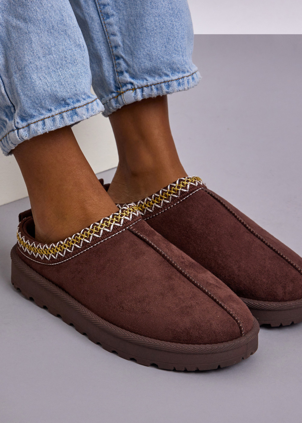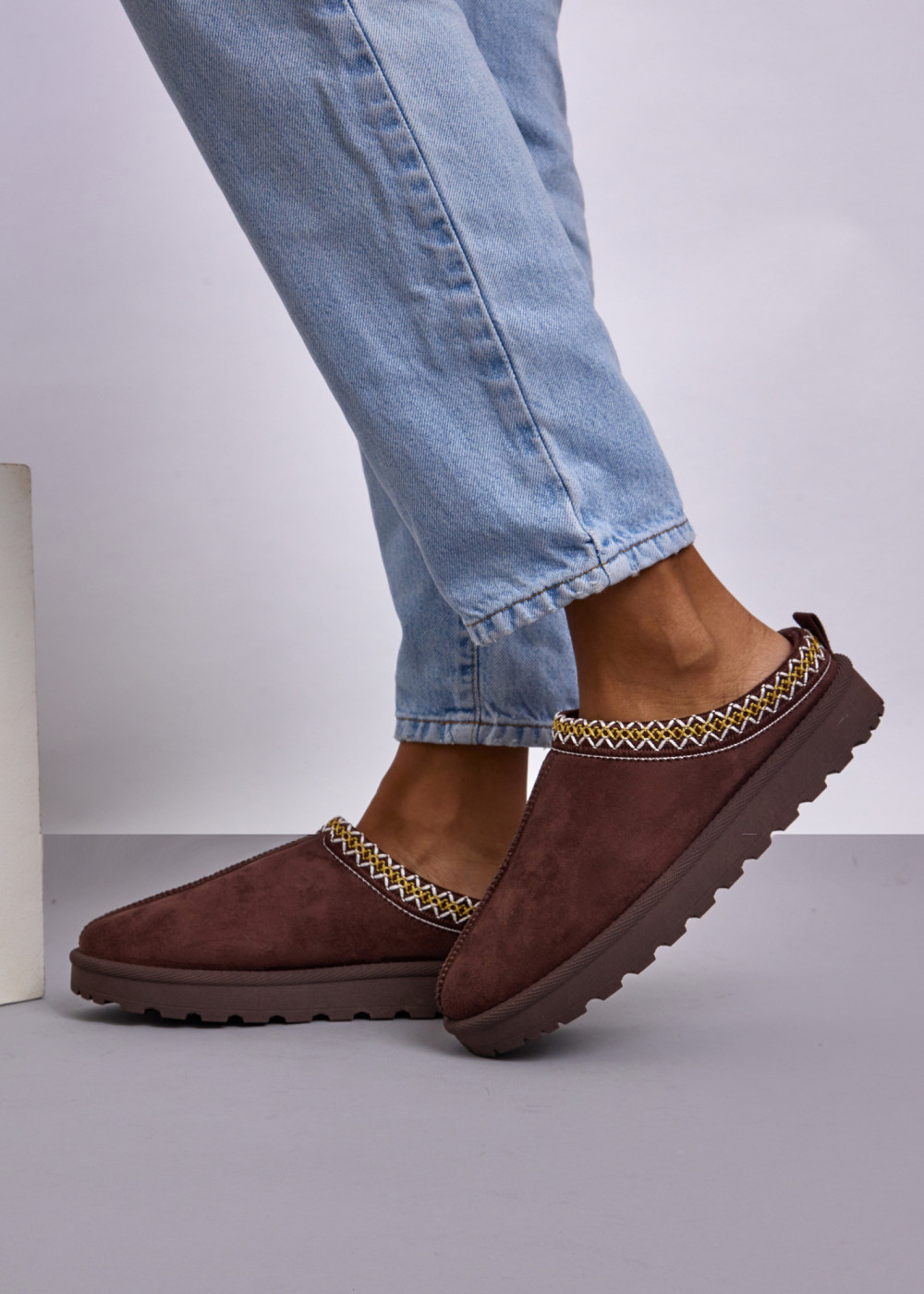 Brown Faux Suede Winter Mules with Decorative Trim