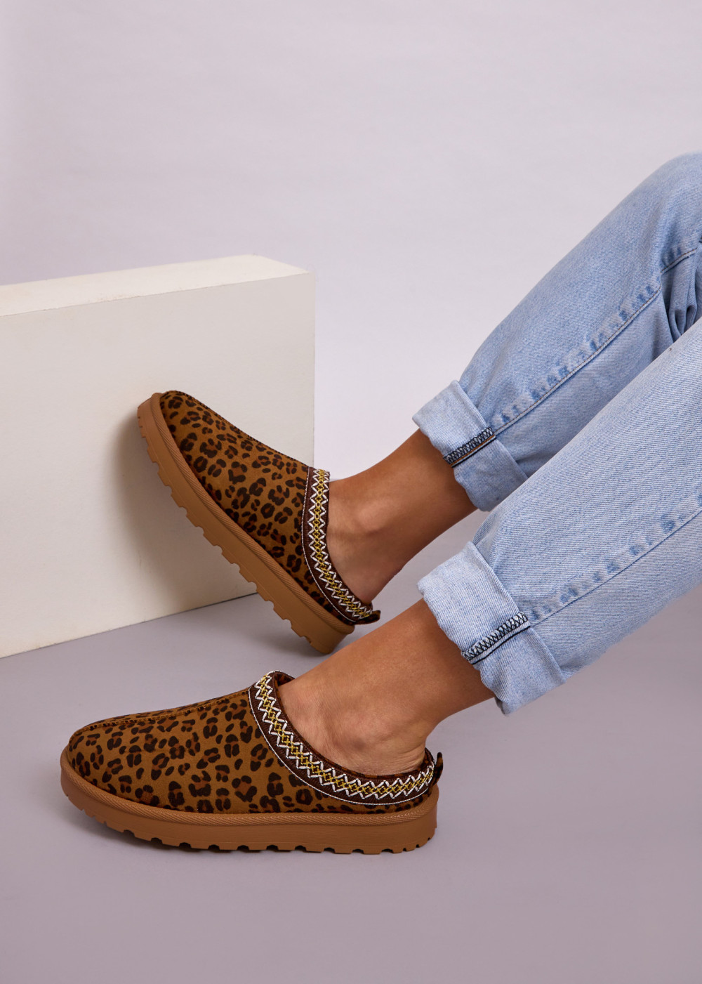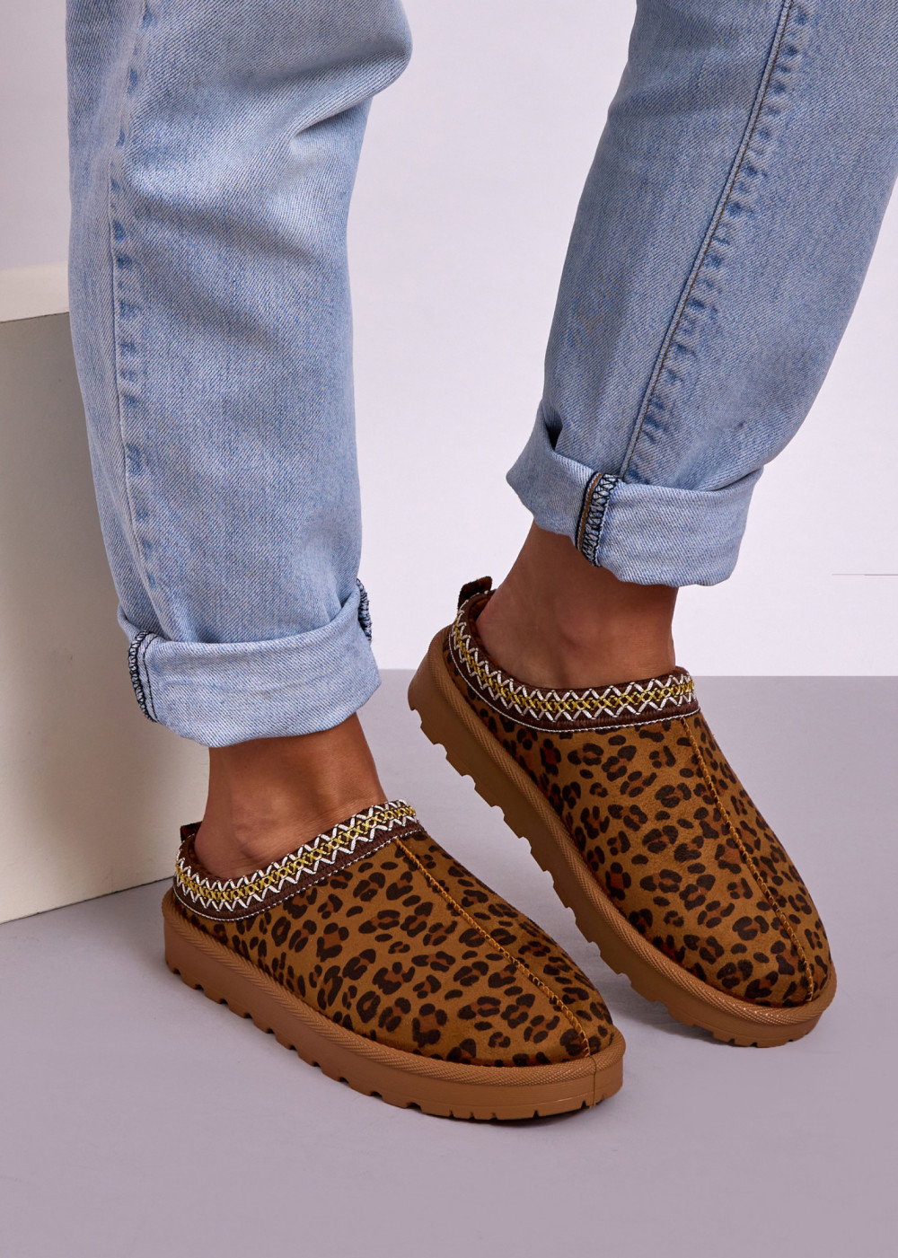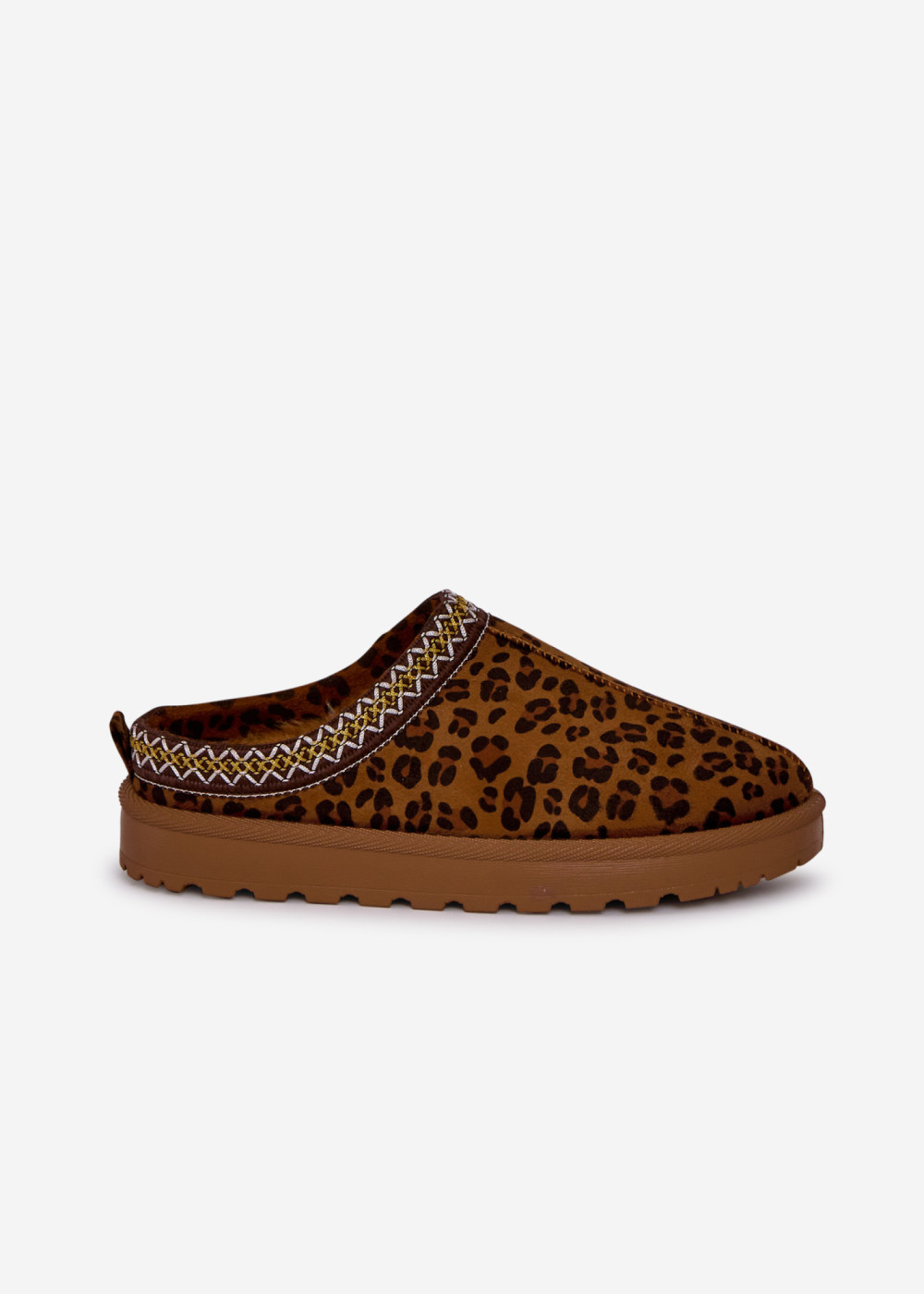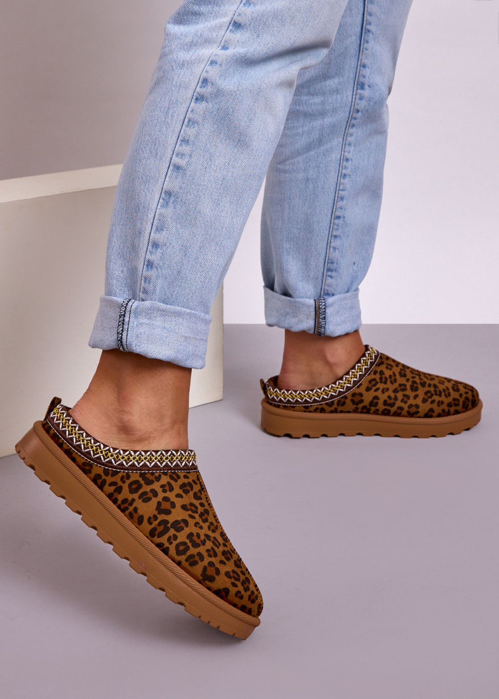 Step into everyday comfort with these women’s leopard print mule slippers—designed for easy slip-on wear and a stylish finish. The soft, suede-effect upper feels cosy against the foot, while the decorative stitched trim around the collar adds a premium, eye-catching detail. A lightweight chunky sole with a grippy tread provides stability and cushioning, making them ideal for moving around the house, popping out to the garden, or quick trips in comfort. The neutral tan base with classic leopard spotting pairs effortlessly with denim, loungewear, or casual weekend outfits. Practical, on-trend and comfortable—these mules are a go-to choice for relaxed Irish living.
