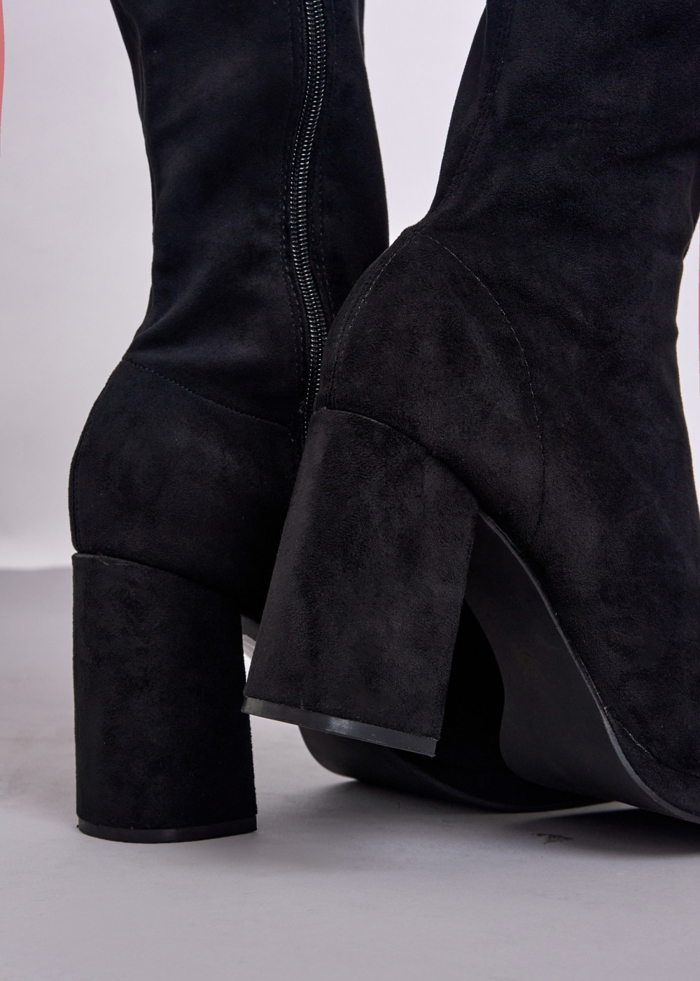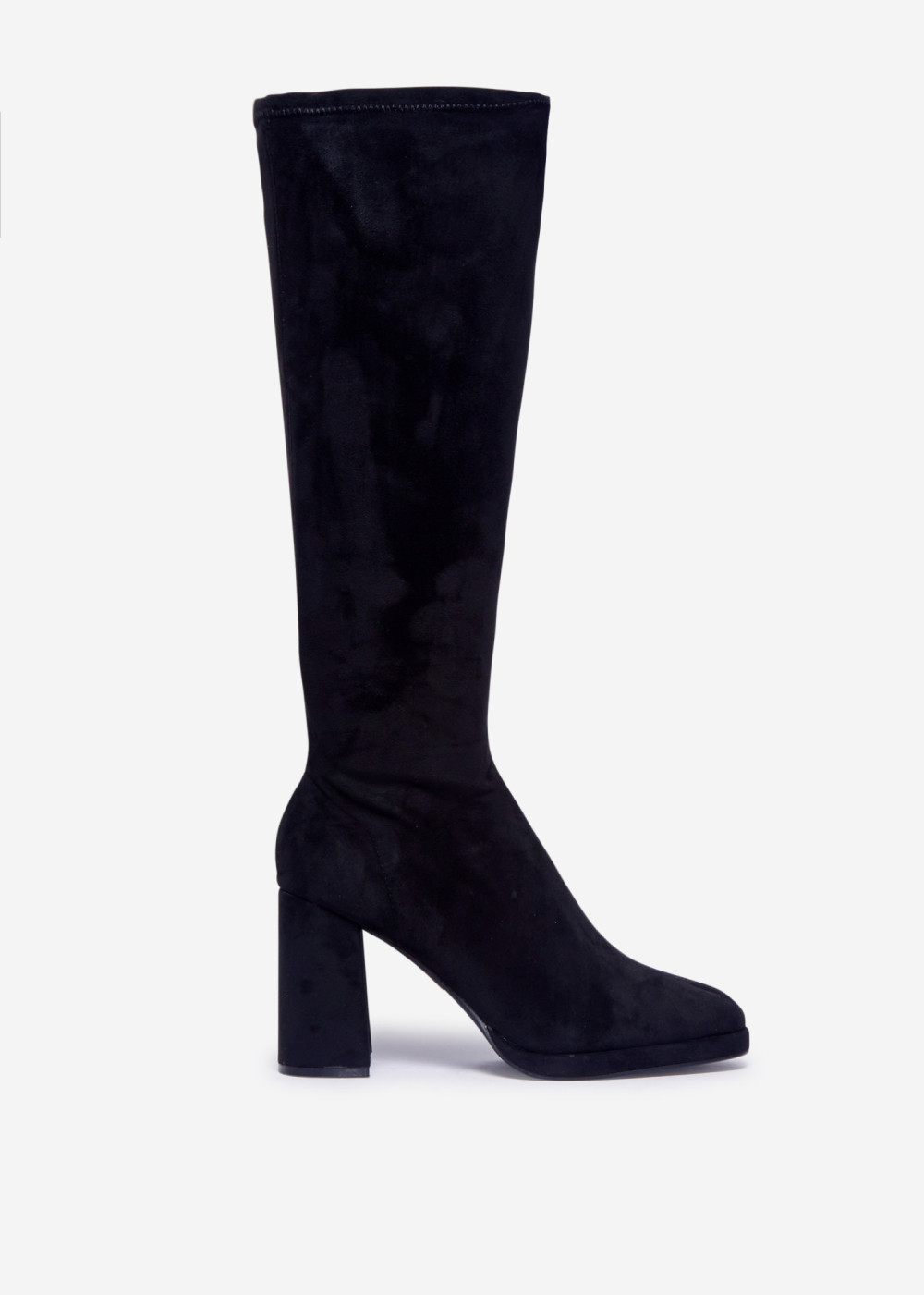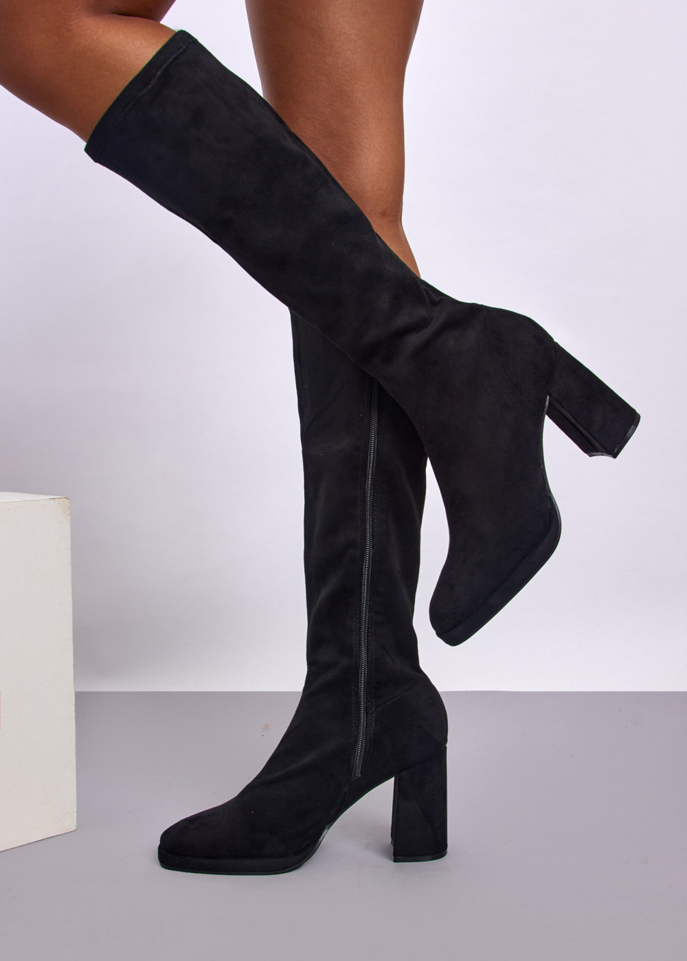 Elevate your autumn and winter wardrobe with these Black Faux Suede Knee-High Block Heel Boots. Crafted from soft faux suede, they offer a sleek, form-fitting silhouette that flatters the leg while providing comfort and stability. The high block heel adds height without sacrificing balance, making them ideal for day-to-night styling. Featuring an inside zip for easy wear, these boots pair effortlessly with dresses, skirts, and tailored coats for a sophisticated, modern look. A perfect choice for chic everyday outfits and elegant evening ensembles.