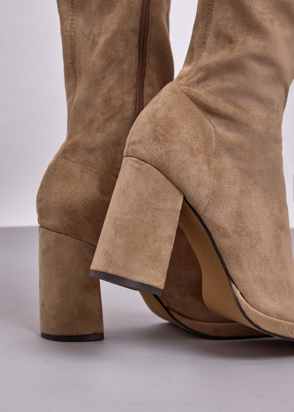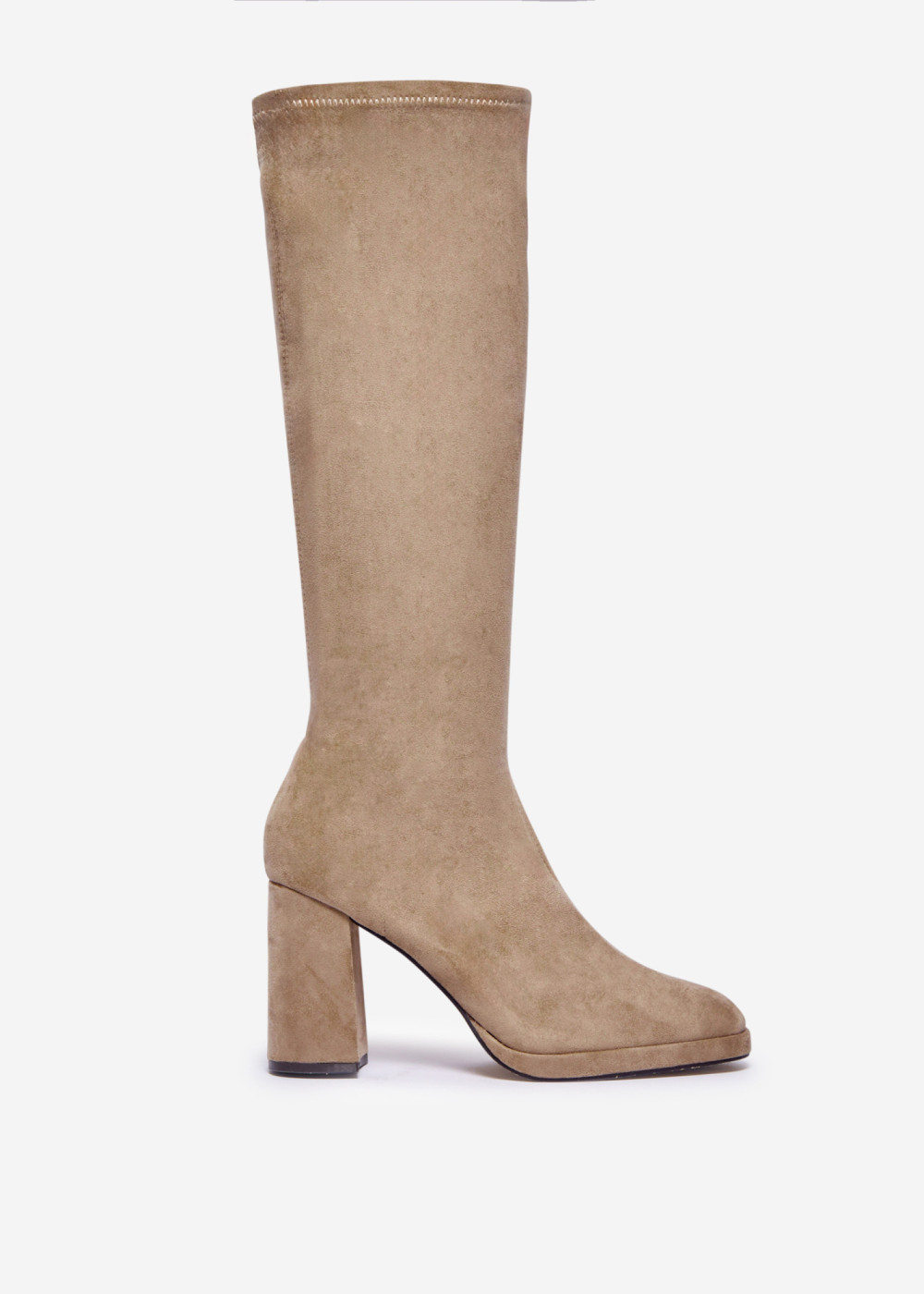 Elevate your seasonal wardrobe with these Khaki Faux Suede Knee-High Block Heel Boots. Made from soft faux suede, they offer a sleek, sculpted fit that flatters the legs while providing all-day comfort. The sturdy block heel adds stylish height without compromising stability, and the inside zip ensures easy on-and-off wear. Their rich khaki tone makes them a perfect match for autumn and winter outfits, pairing beautifully with dresses, skirts, oversized knits, and tailored coats. A refined yet versatile choice for both everyday elegance and evening styling.