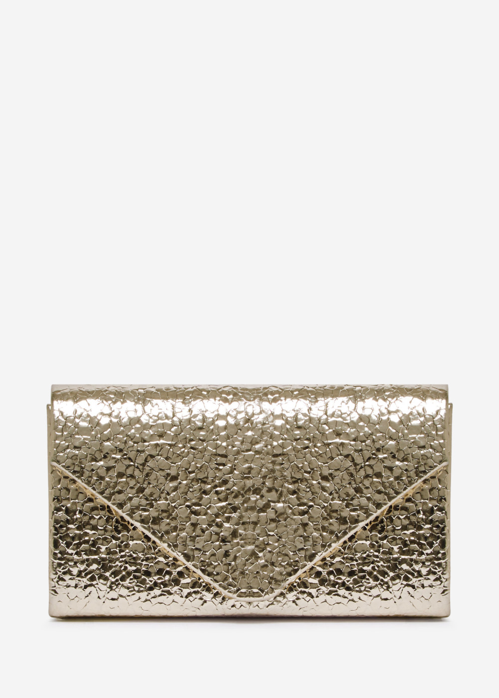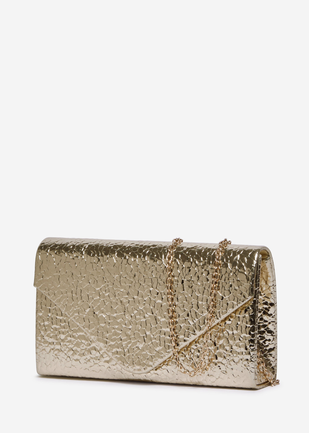 Add a touch of luxury and radiance to your occasion look with this stunning Gold Patent Textured Envelope Chain Strap Evening Clutch Bag. Its high-shine metallic finish and unique cracked-texture pattern create a bold yet elegant statement, perfect for complementing both classic and modern evening outfits.