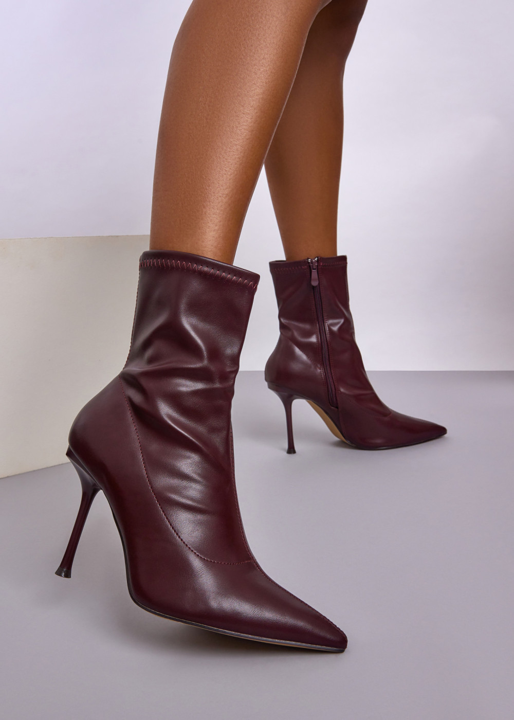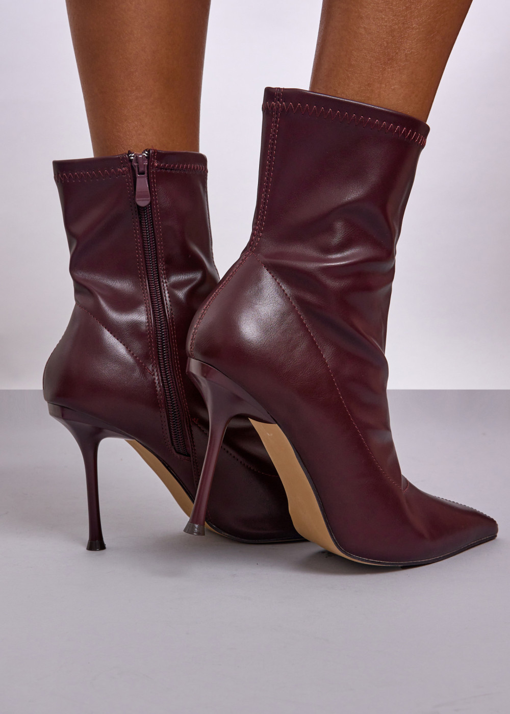 Refine your look with these Burgundy Pointed Toe Stretch Faux Leather Stiletto Ankle Boots. Designed with a sleek, form-fitting silhouette, they are crafted from smooth stretch faux leather that contours comfortably around the ankle. The pointed toe and slim stiletto heel create an elegant, elongated profile, while the side zip allows for easy fastening. Perfect for evenings out, special occasions, or elevating everyday outfits, these ankle boots offer a chic and modern finish that pairs effortlessly with dresses, skirts, or tailored trousers.