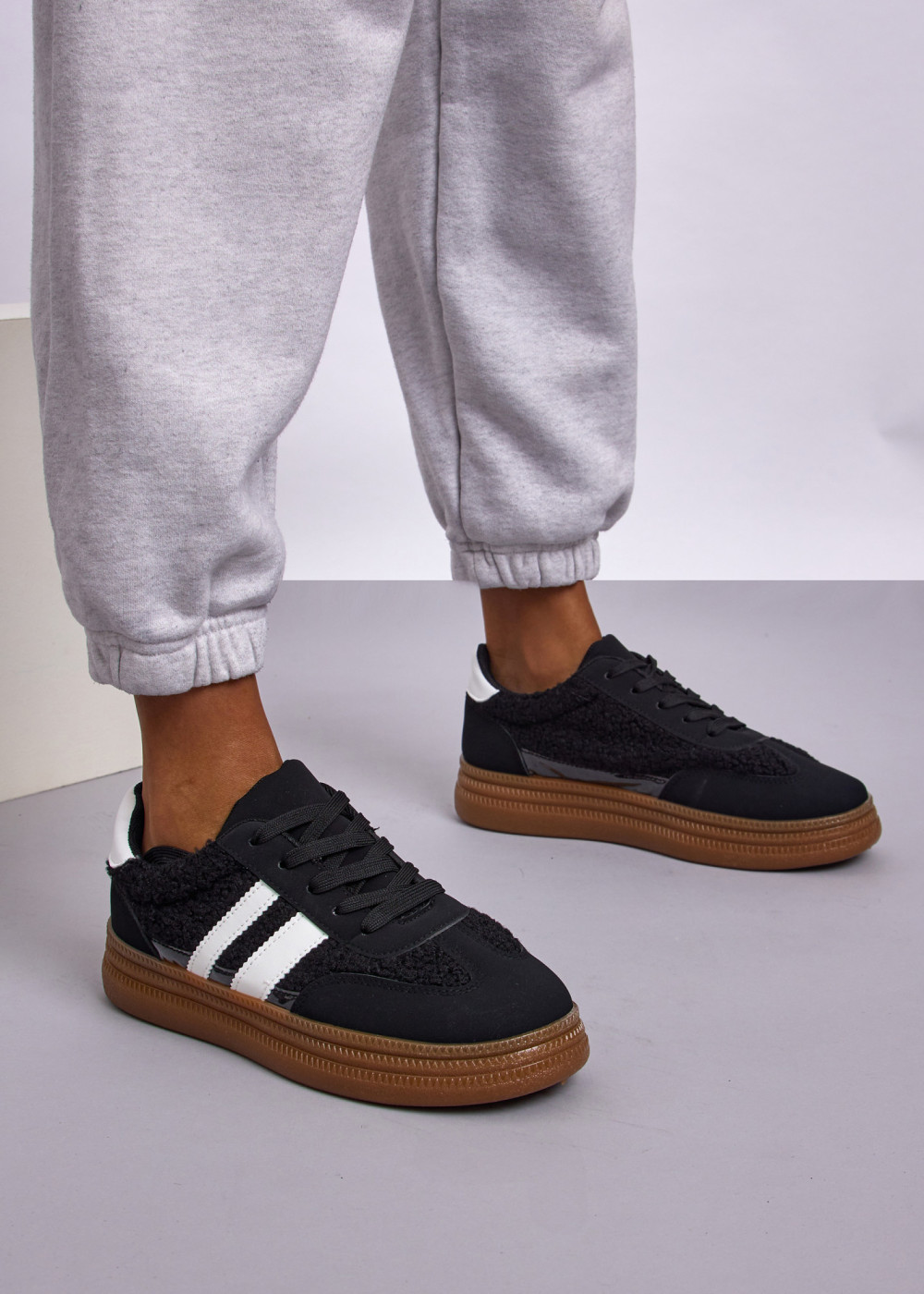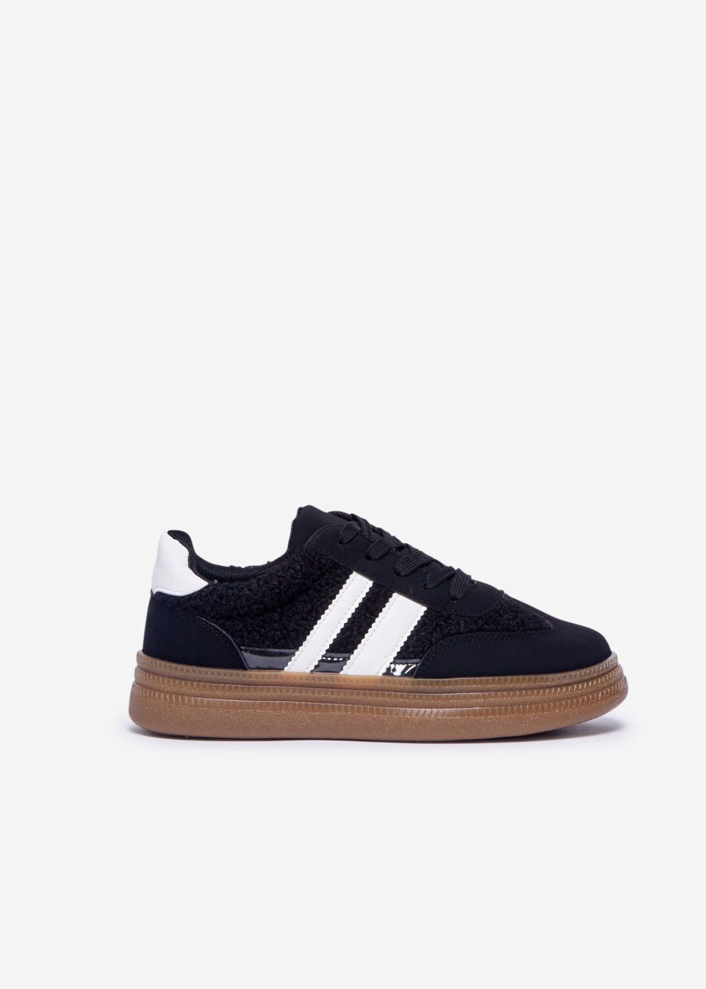 Refresh your casual wardrobe with these Black Textured Panel Sneakers with Contrast Stripes. Designed with a mix of smooth and textured materials for a modern, sporty look, they feature classic lace-up fastening and bold white side stripes that add a striking contrast. The cushioned gum-tone sole ensures all-day comfort and stability, making them ideal for everyday wear, running errands, or pairing with athleisure and denim outfits. Stylish, versatile, and easy to match—your new go-to trainers for effortless daily styling.