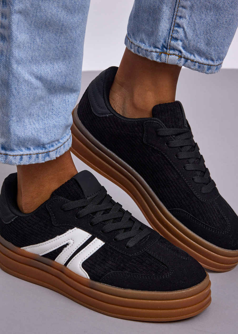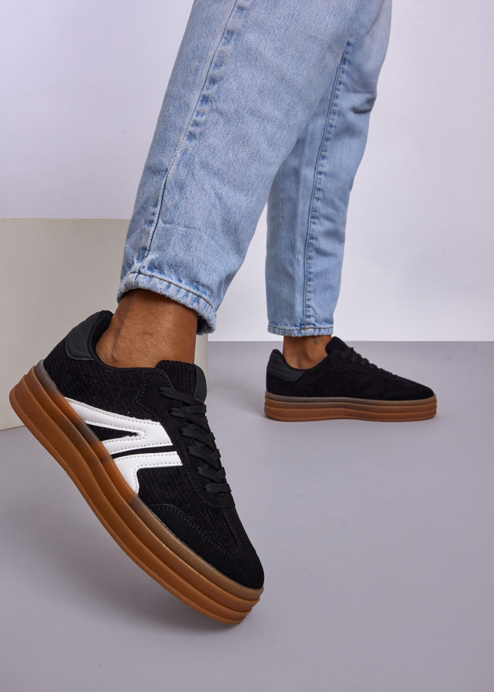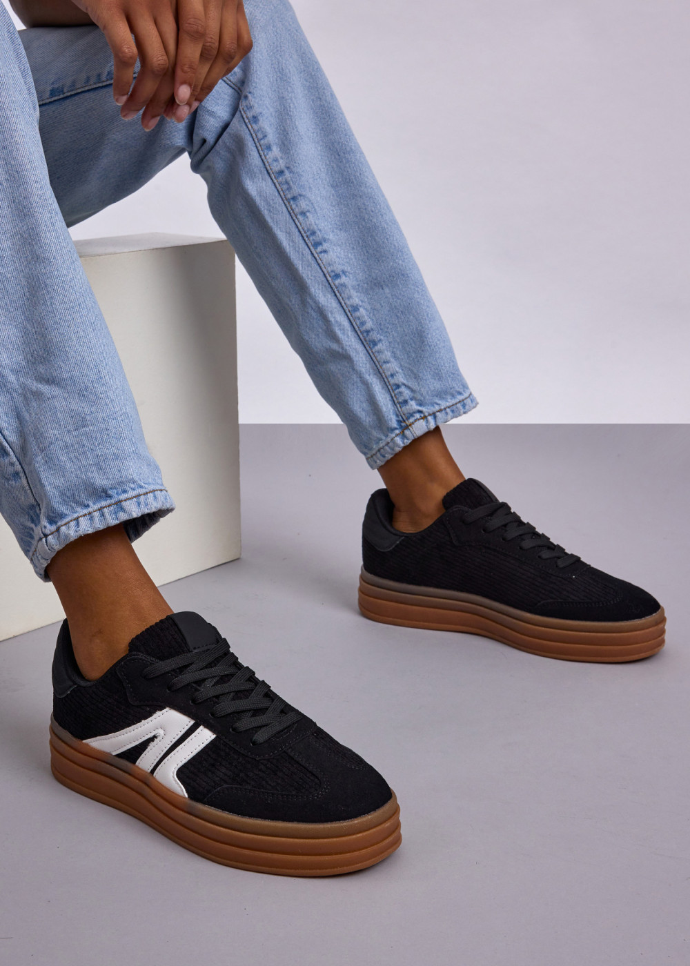 Black Corduroy Platform Sneakers with Contrast Side Detail