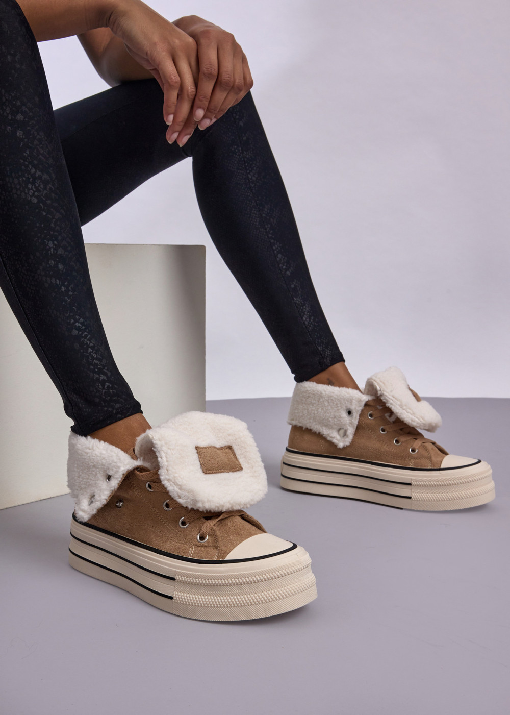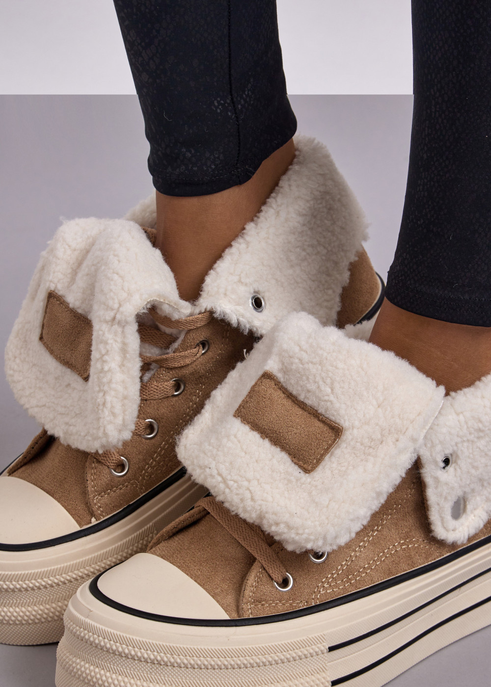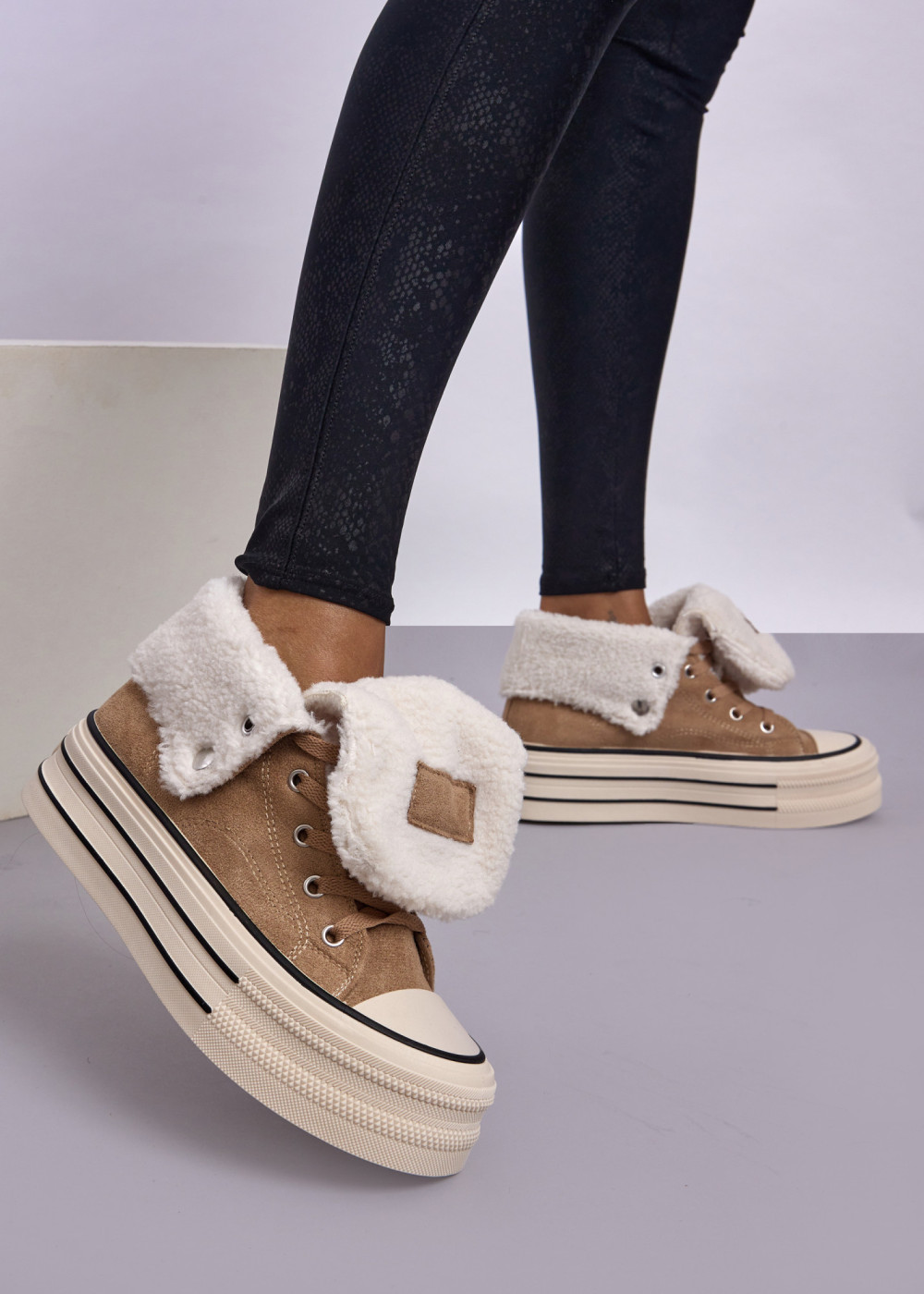 Stay warm, stylish and comfortable all season long with our Khaki Faux Suede Platform Winter Sneakers featuring a fold-over sherpa cuff. These winter-ready sneakers combine soft faux suede with a plush sherpa lining, providing superior warmth and a cosy feel with every step.