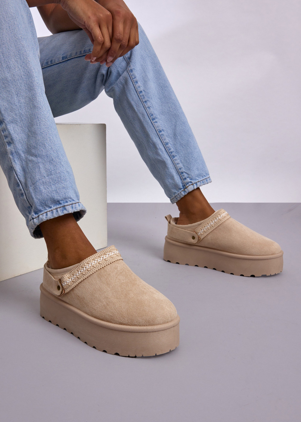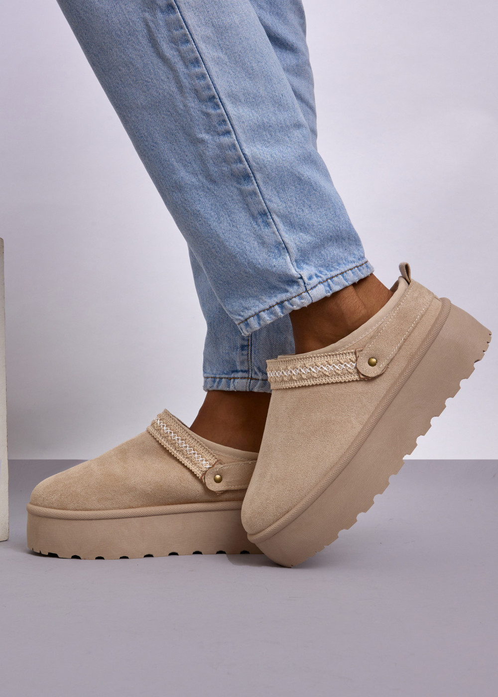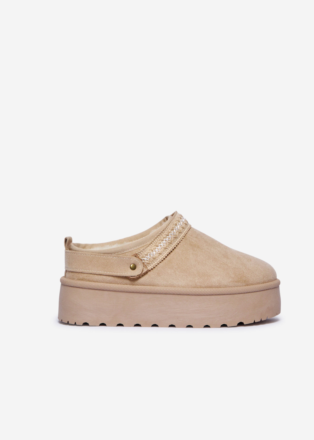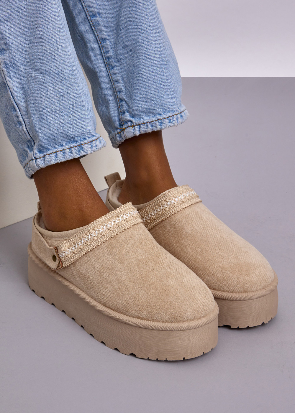 Bring cosy, effortless style to your everyday looks with these Beige Faux Suede Platform Mule Slippers. Crafted from soft faux suede, this slip-on mule design offers plush comfort and a warm feel, while the chunky platform sole provides lightweight support and modern elevation. The embroidered decorative strap adds a charming, artisanal-inspired touch that enhances the overall aesthetic.