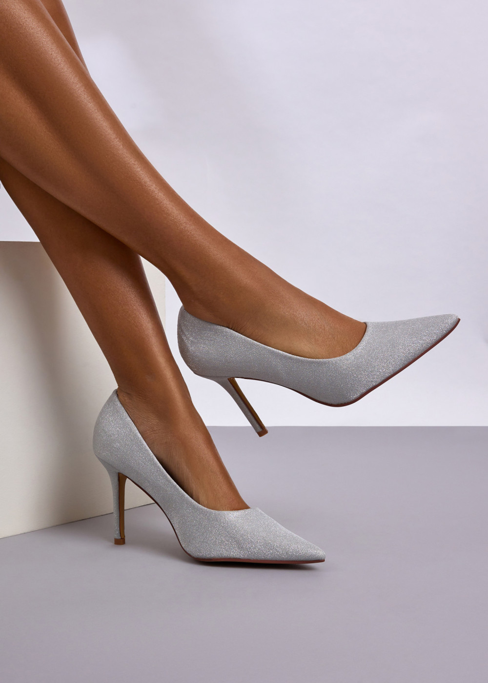 Make a dazzling entrance with these Silver Glitter Pointed Toe Stiletto Heels. Designed with an elegant pointed toe and a slim stiletto heel, this pair brings effortless glamour to any evening or special occasion. The shimmering silver glitter finish catches the light beautifully, making these heels the perfect choice for parties, weddings, celebrations, and standout event looks.