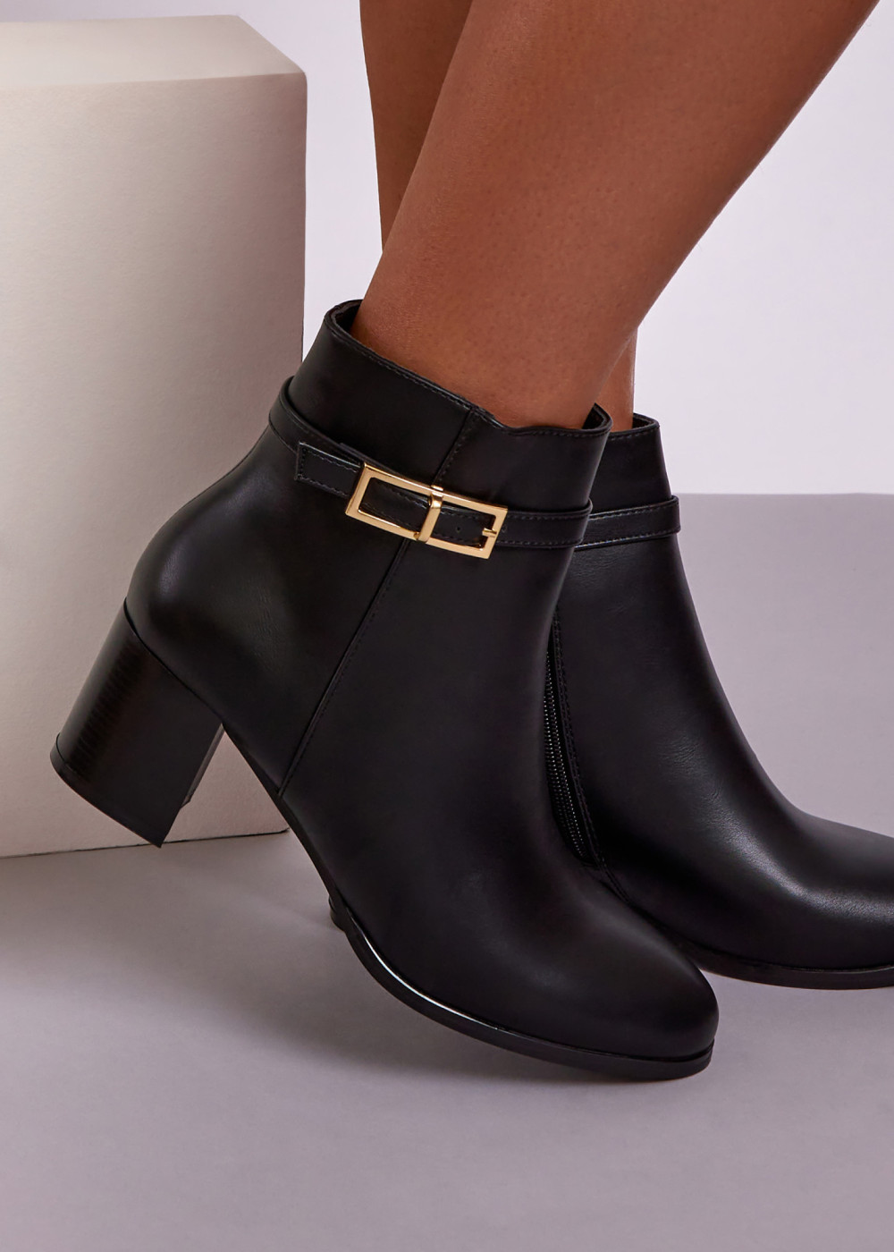 Complete your everyday wardrobe with these classic black ankle boots, designed for comfort and effortless style. Featuring a smooth leather-look finish and a sturdy block heel, this design offers reliable support while maintaining a clean, elegant silhouette. The ankle strap with subtle buckle detail adds a refined accent, and the side zip fastening ensures easy wear. Perfect for work, weekends, and evening outings, these boots are a versatile staple for autumn and winter.