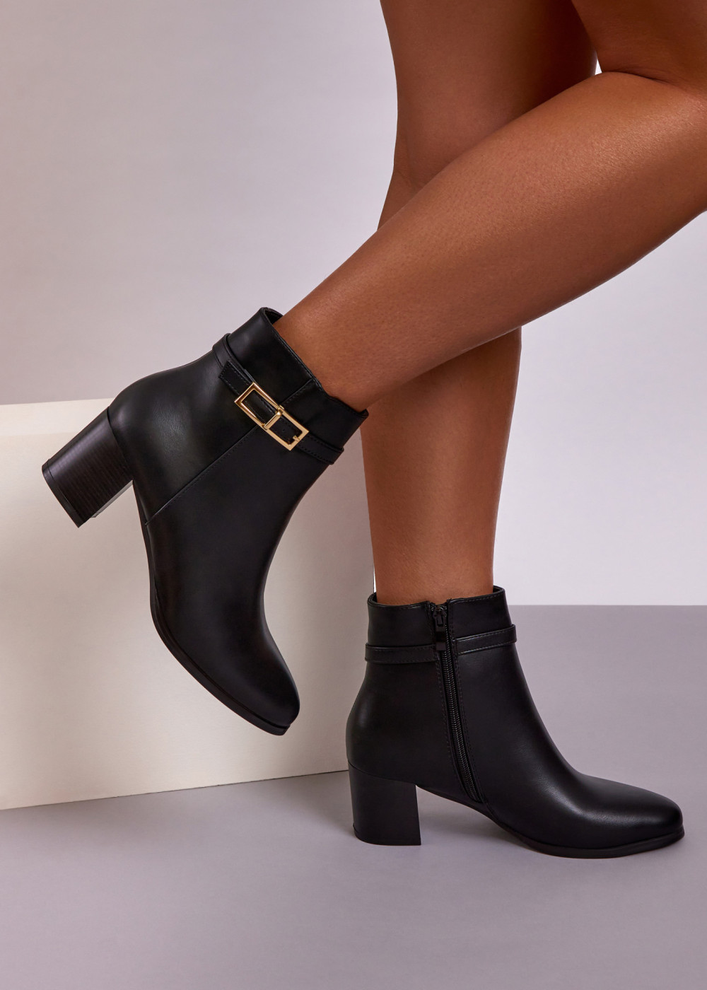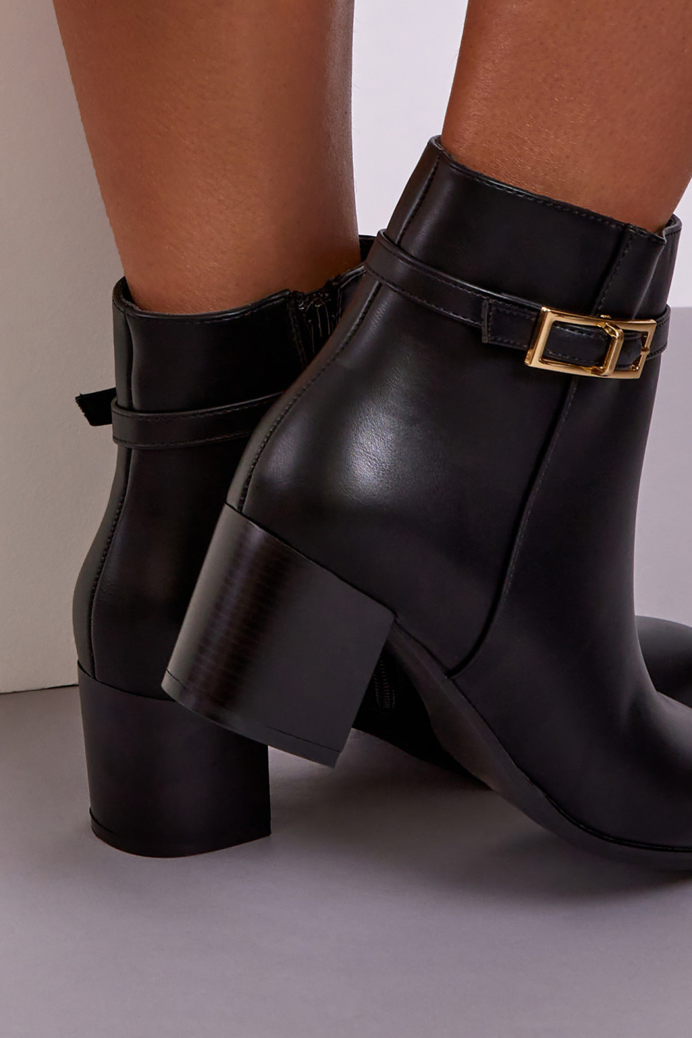 Black Block Heel Ankle Boots with Buckle