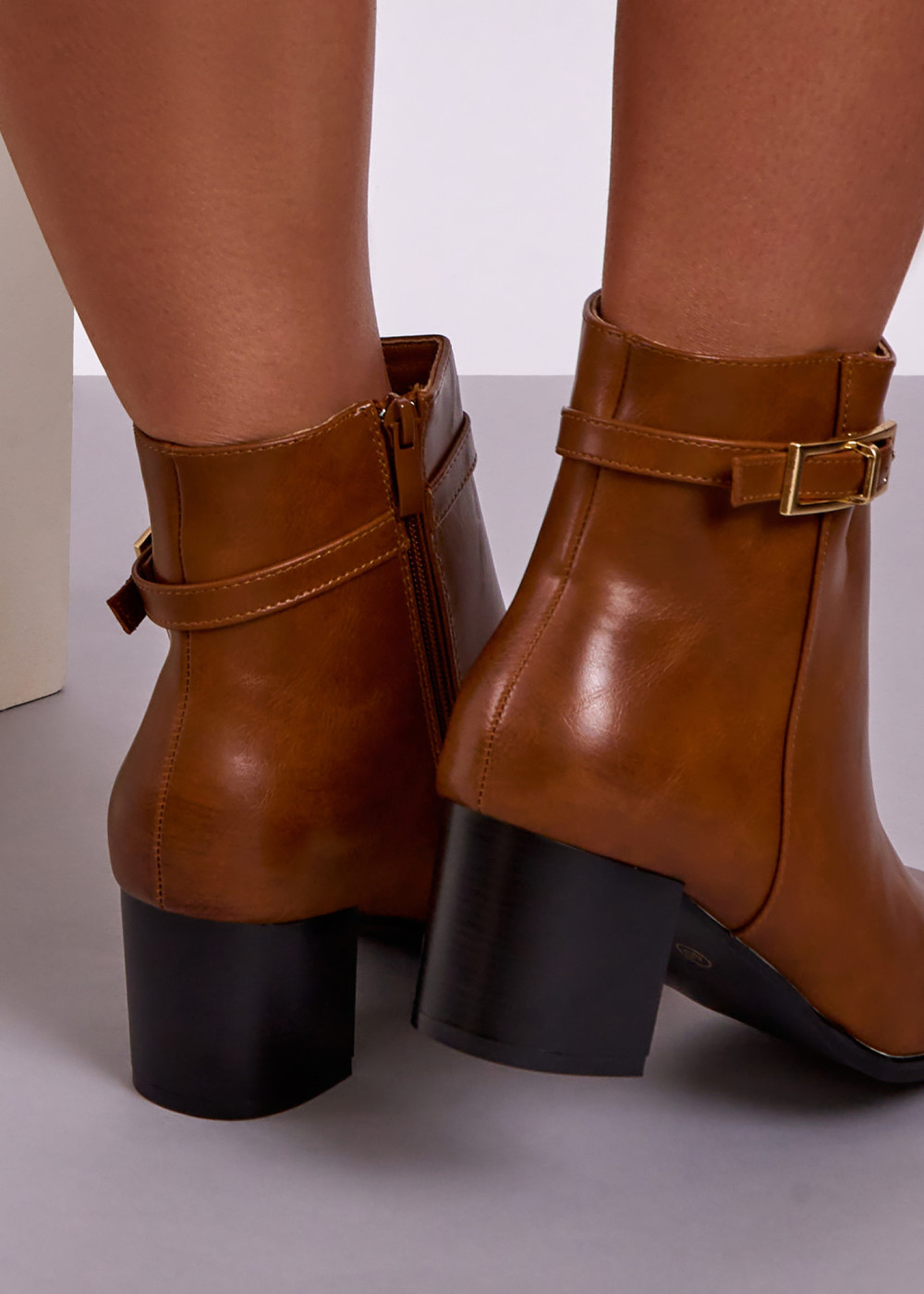 Tan Block Heel Ankle Boots with Buckle