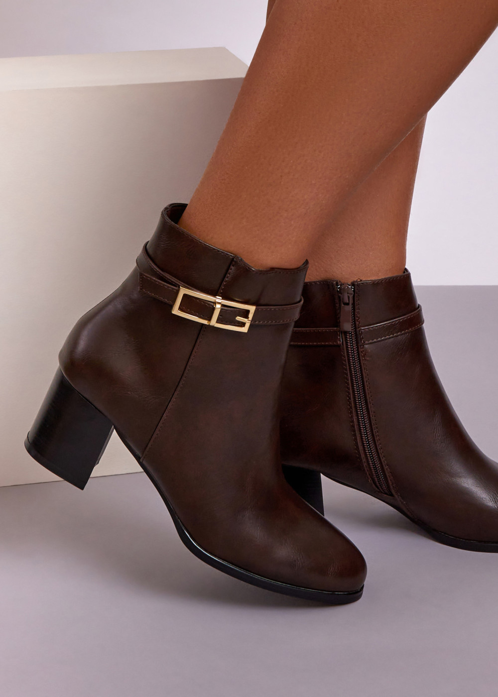 Refresh your autumn and winter footwear with these classic brown ankle boots. Designed with a smooth leather-look finish and a comfortable block heel, this style offers everyday ease with a polished appearance. The subtle ankle strap with buckle detail adds a refined touch, while the side zip fastening allows for quick and easy wear. Finished in a warm brown tone, these boots pair effortlessly with jeans, trousers, and seasonal dresses.
