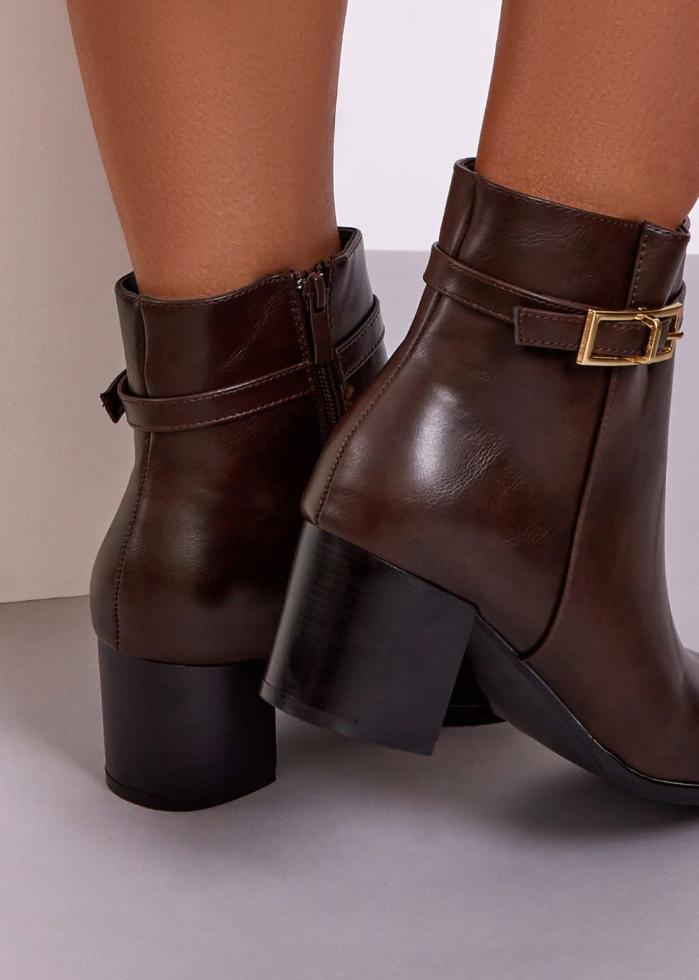 Brown Block Heel Ankle Boots with Buckle
