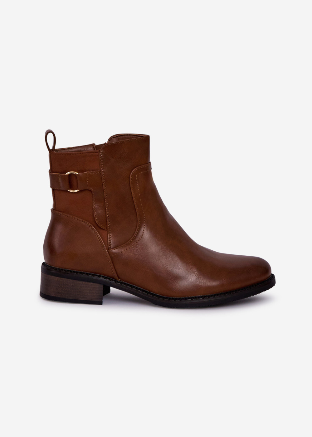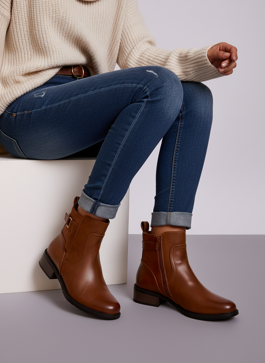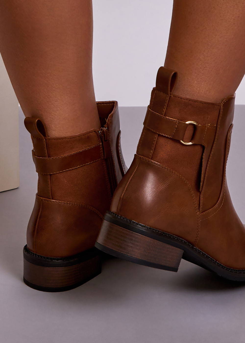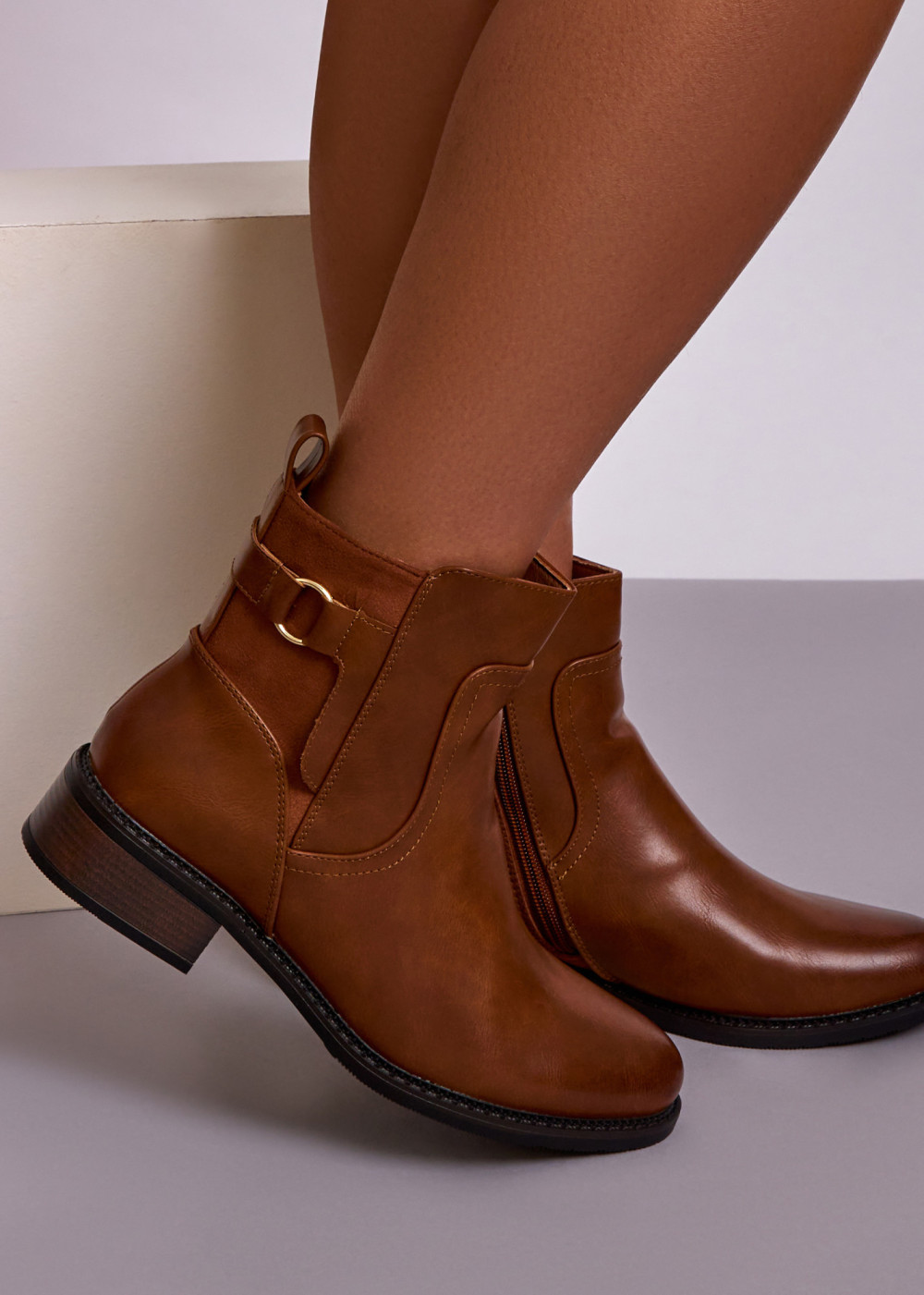 These tan ankle boots are a versatile and stylish choice for everyday wear. Designed with a smooth leather-look finish, they feature a classic ankle-height silhouette, a low block heel for added stability, and a refined buckle detail that adds a subtle touch of elegance.
