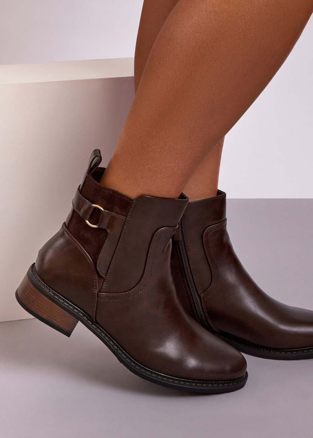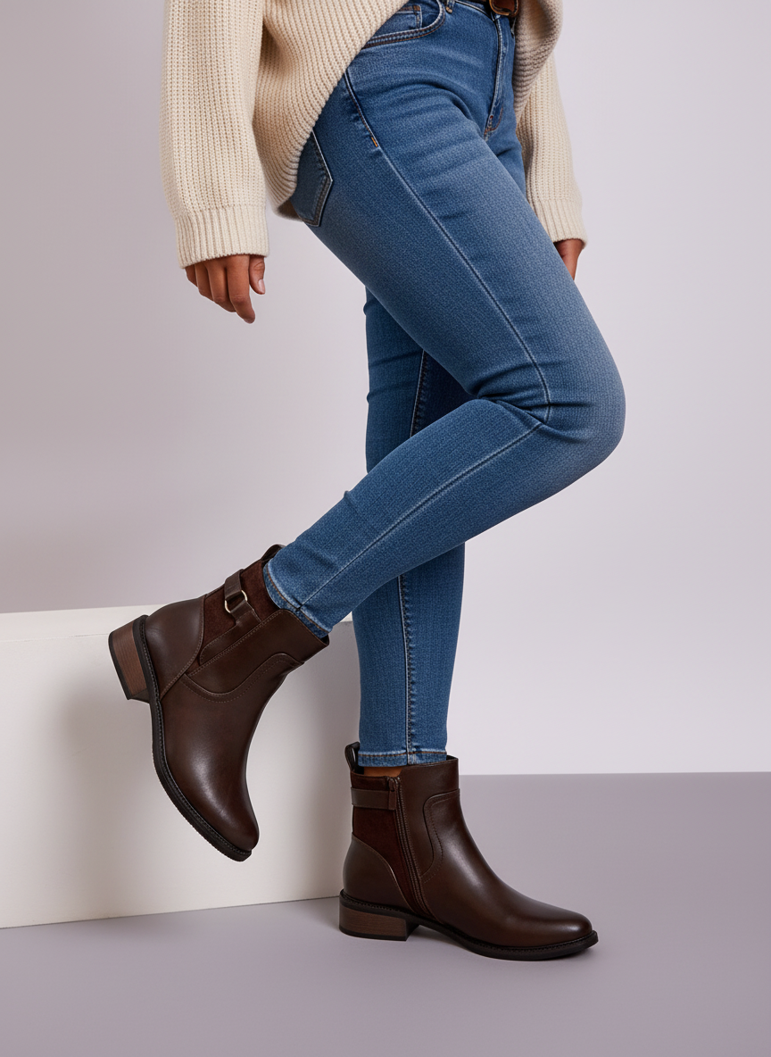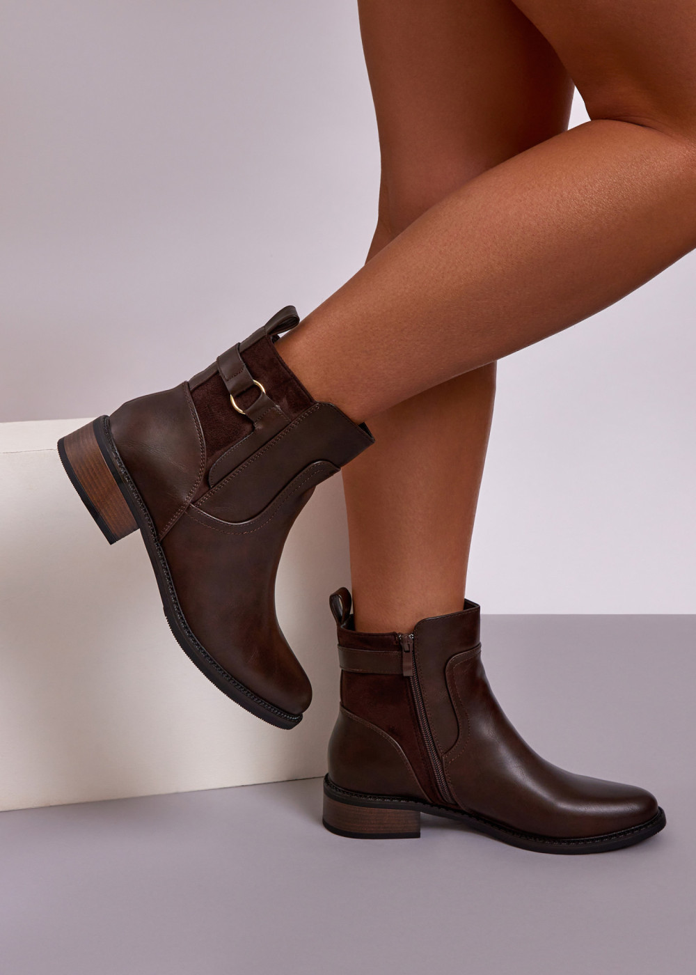 These brown ankle boots combine everyday comfort with classic, easy-to-style design. Crafted with a smooth leather-look finish and faux suede-style panel detailing, they feature a timeless ankle-height silhouette and an elegant buckle accent that adds subtle character.