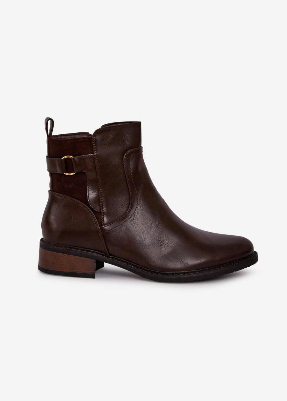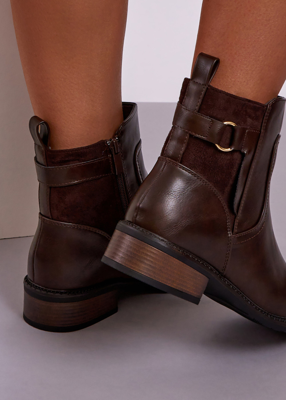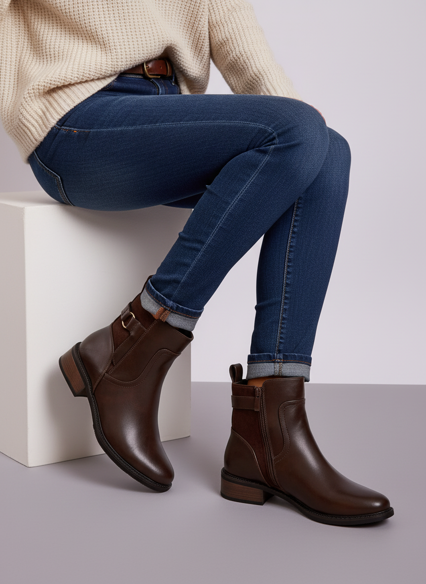 These brown ankle boots combine everyday comfort with classic, easy-to-style design. Crafted with a smooth leather-look finish and faux suede-style panel detailing, they feature a timeless ankle-height silhouette and an elegant buckle accent that adds subtle character.