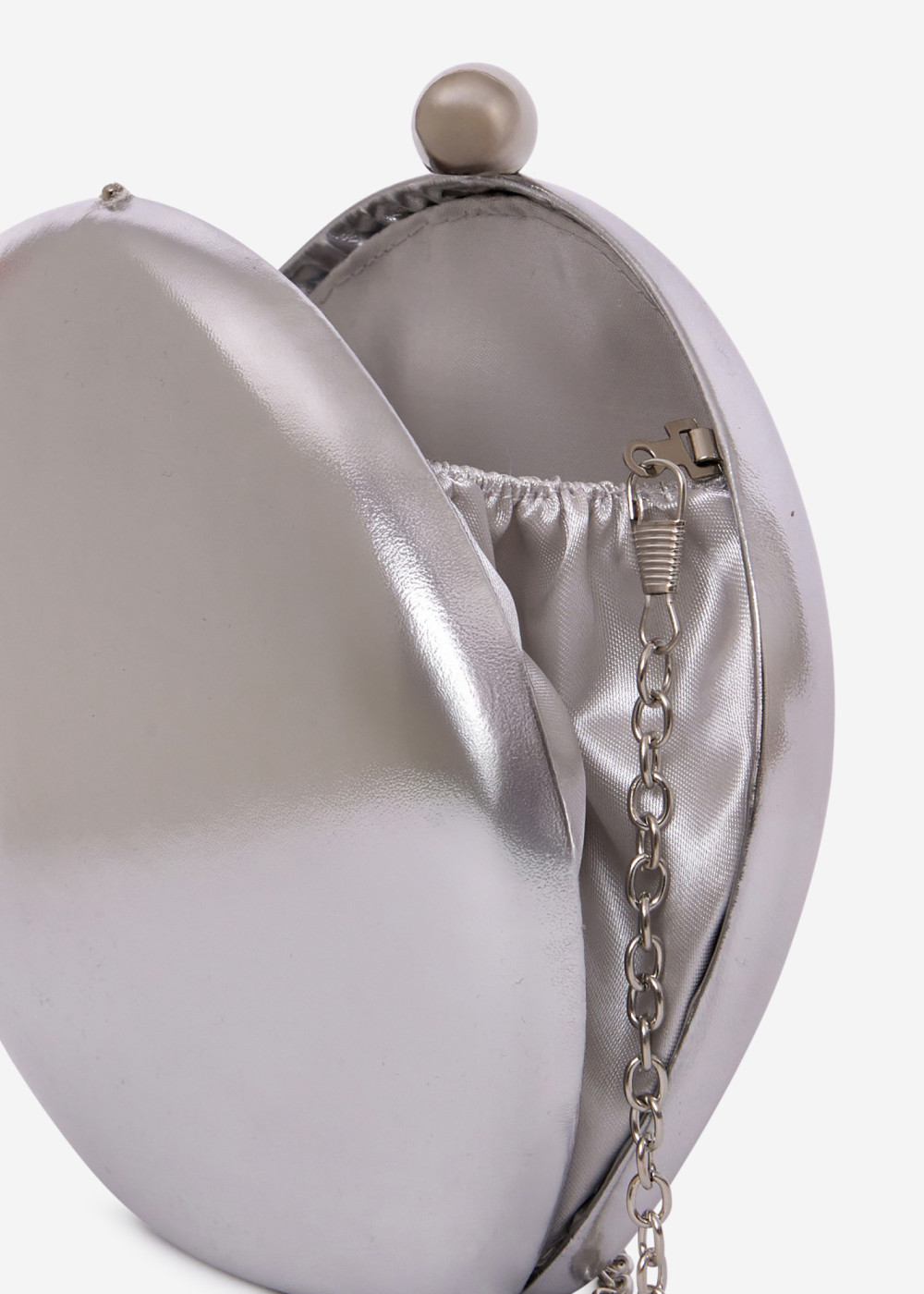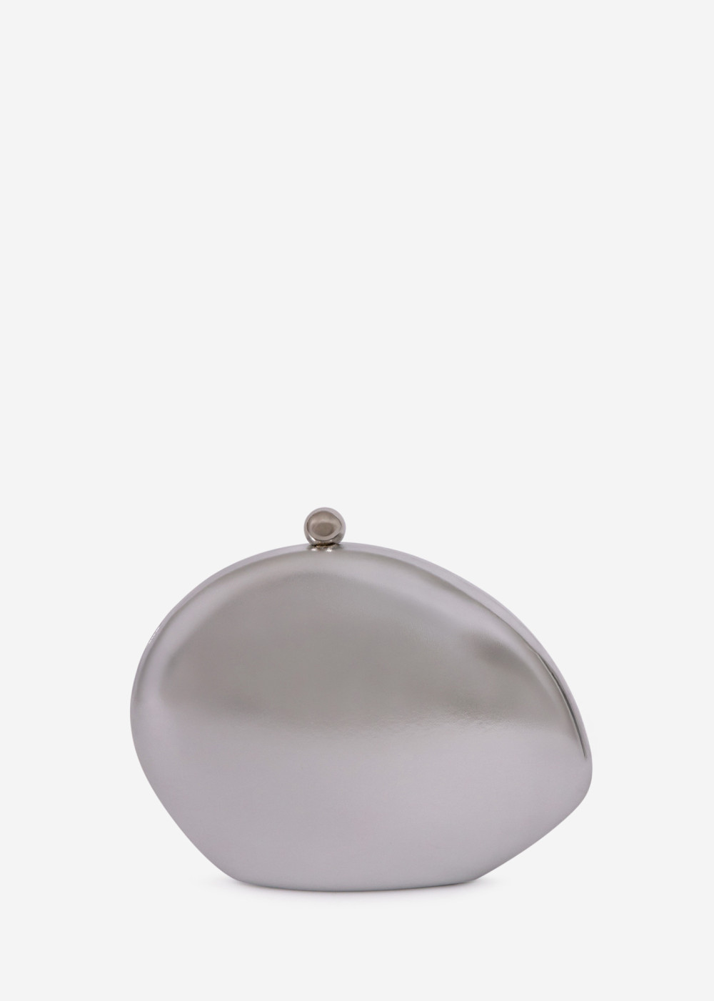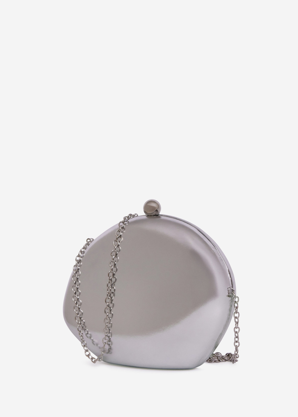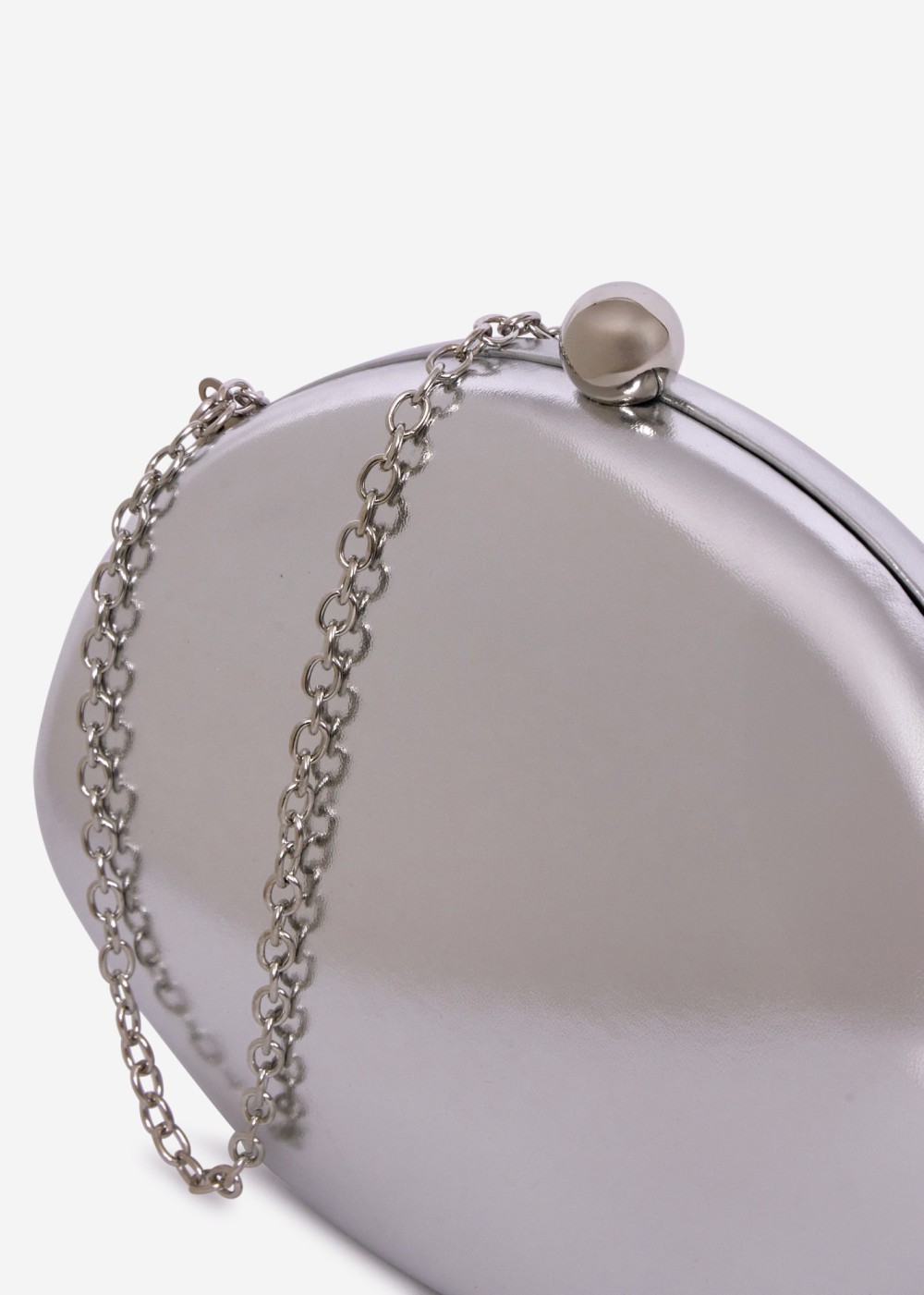 This elegant silver metallic clutch bag is the perfect accessory for evening events, weddings, parties, and formal occasions. Designed with a smooth, structured shell and a refined rounded silhouette, it adds a modern yet timeless touch to any outfit. The clutch features a secure ball clasp closure and a detachable silver-tone chain strap, allowing it to be worn as a shoulder bag or carried by hand.
