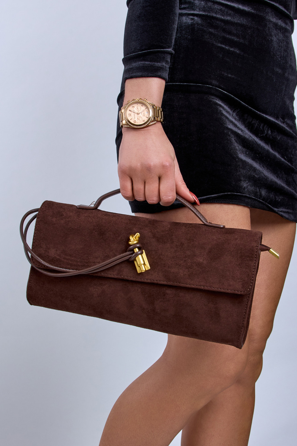 This elegant dark brown faux suede bag is a sophisticated accessory designed for modern women who value timeless style. Made from soft faux suede with a structured silhouette, it features a fold-over flap with a decorative knot and gold-tone hardware for a refined finish.