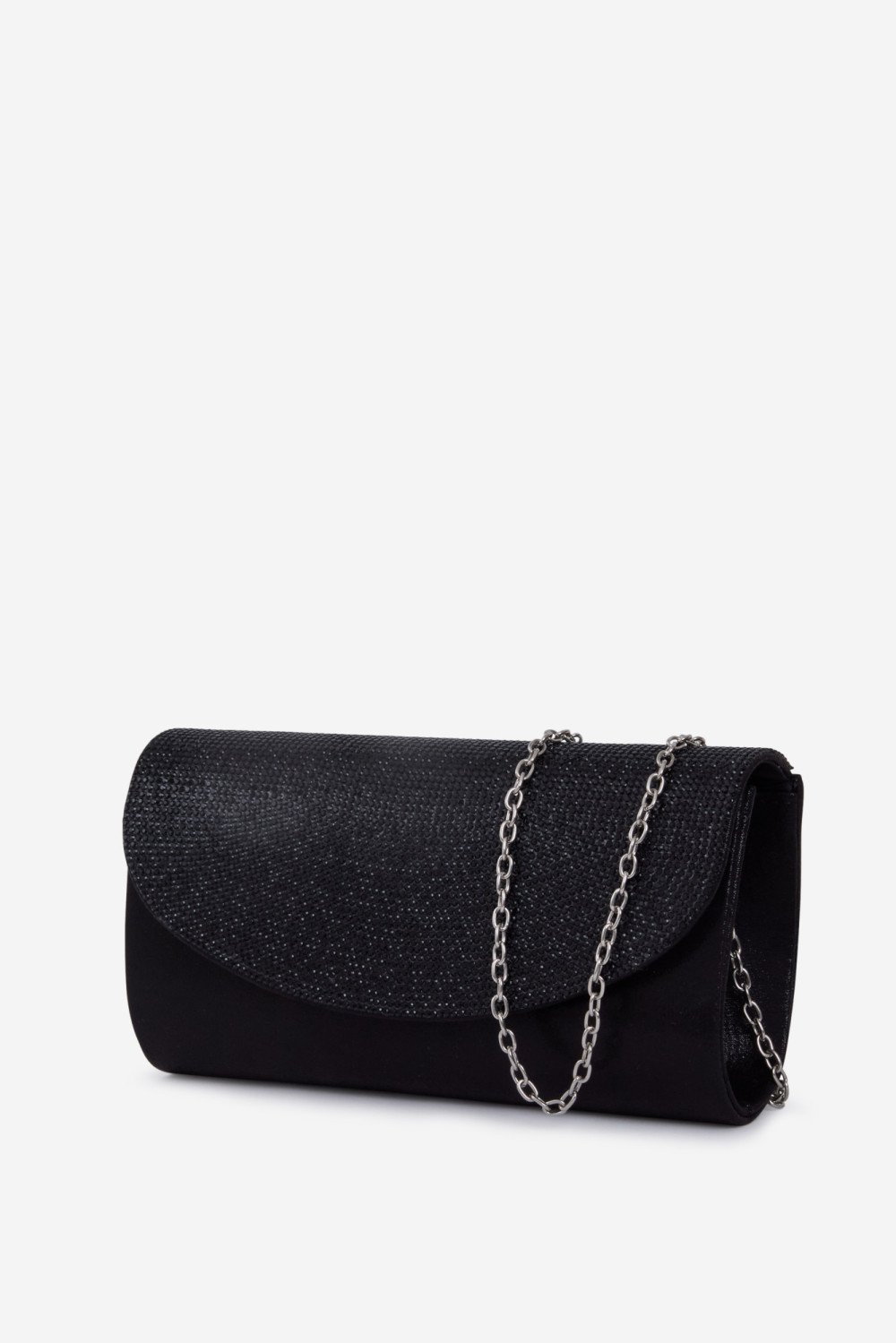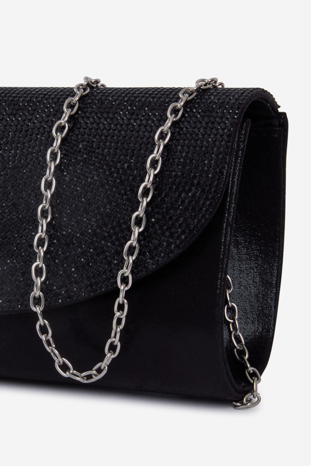 Crafted in a sleek black satin-style finish, the clutch includes a detachable silver chain strap, allowing it to be worn over the shoulder or carried as a classic hand-held bag. The secure flap closure keeps essentials safely stored, with enough space for your phone, makeup and small accessories.