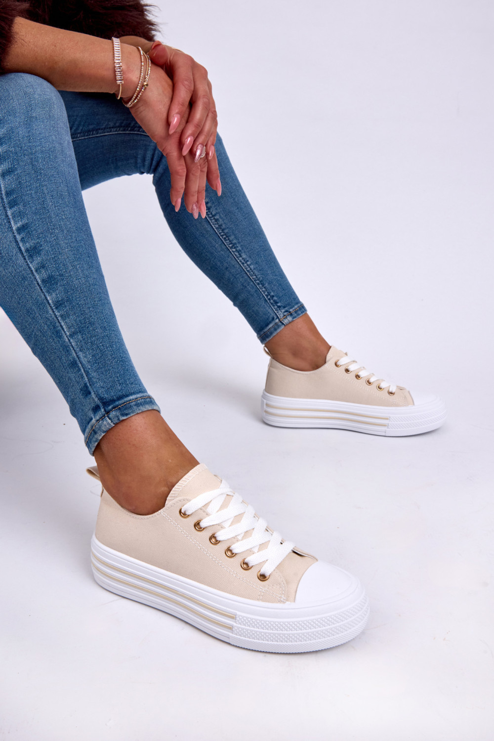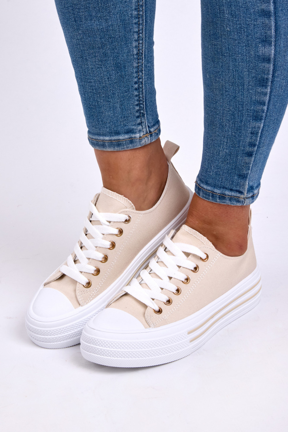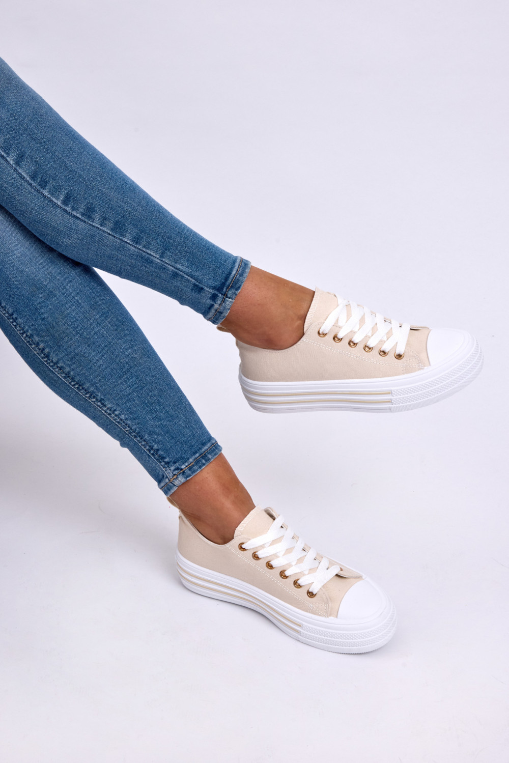 These beige canvas platform trainers offer a soft neutral tone that complements any outfit. Crafted from breathable textile material with classic lace-up fastening, they provide comfort and flexibility for everyday wear.