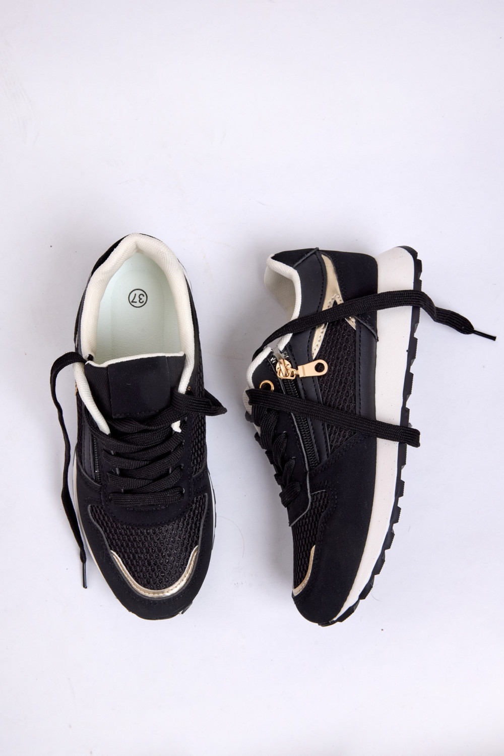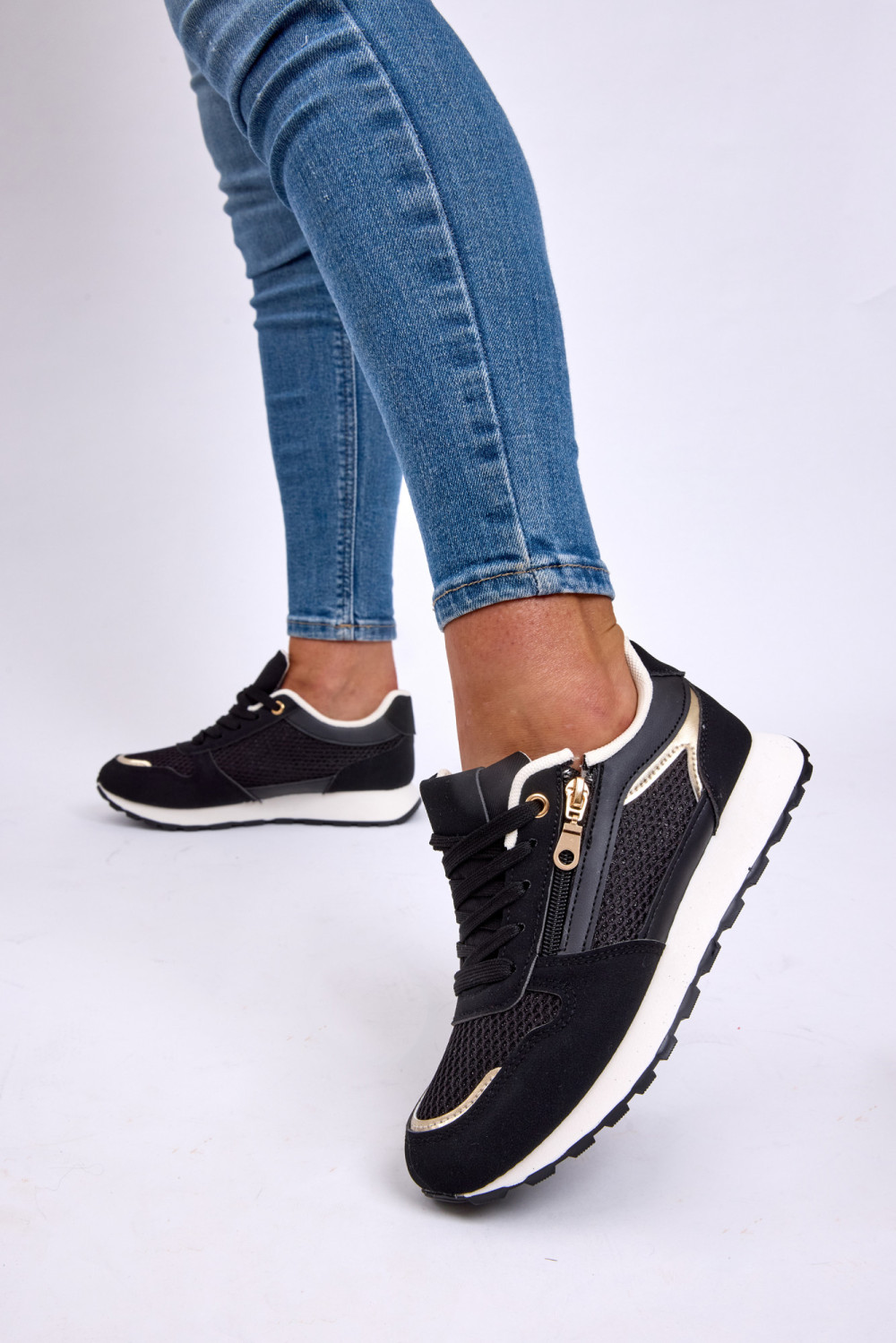 Designed for all-day comfort, these black lightweight trainers combine sporty style with practical functionality. The breathable mesh upper keeps feet cool, while the lace-up front and side zip fastening allow quick and easy fitting.