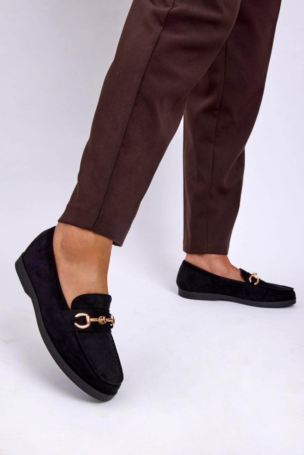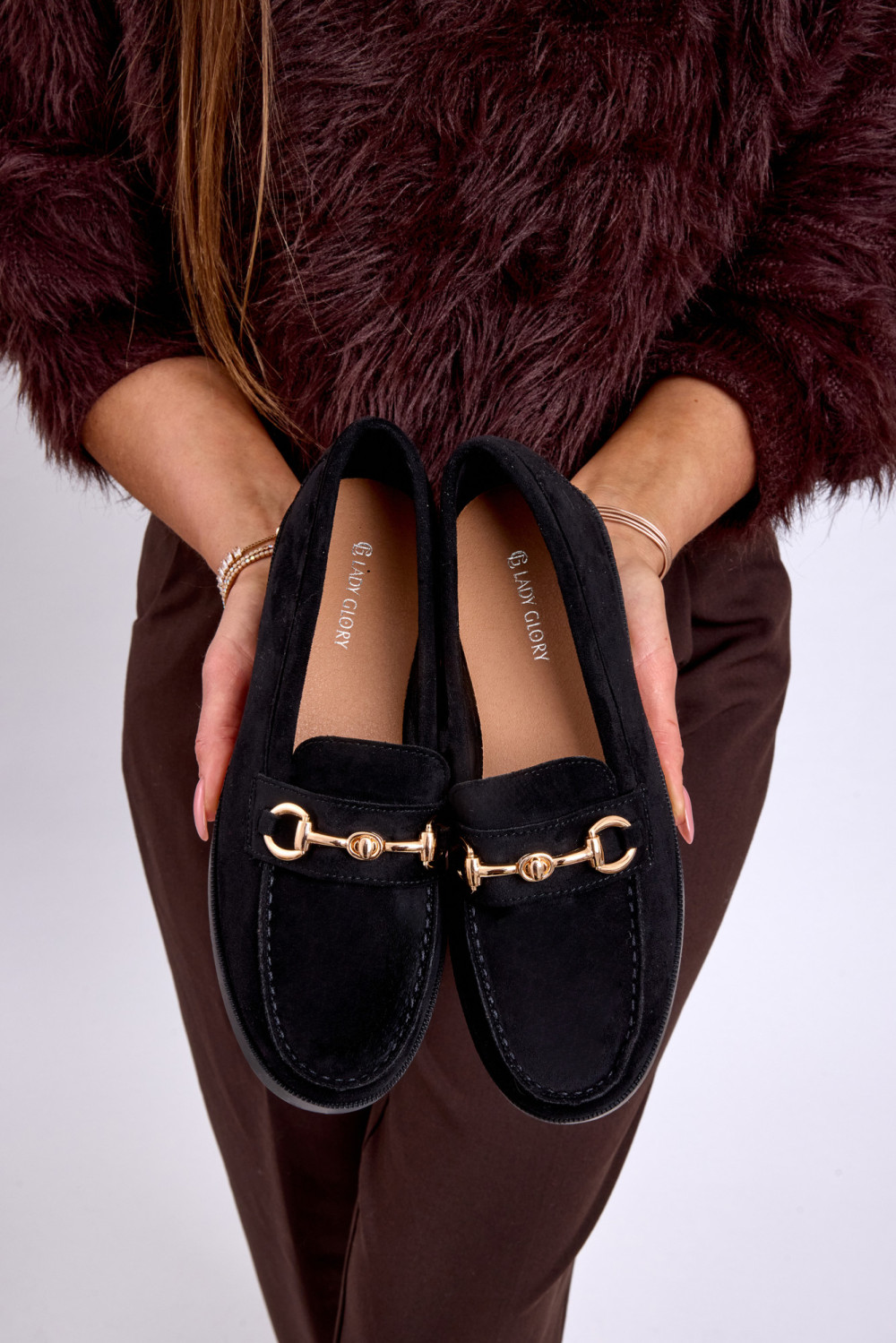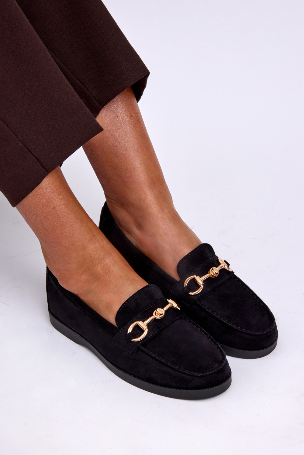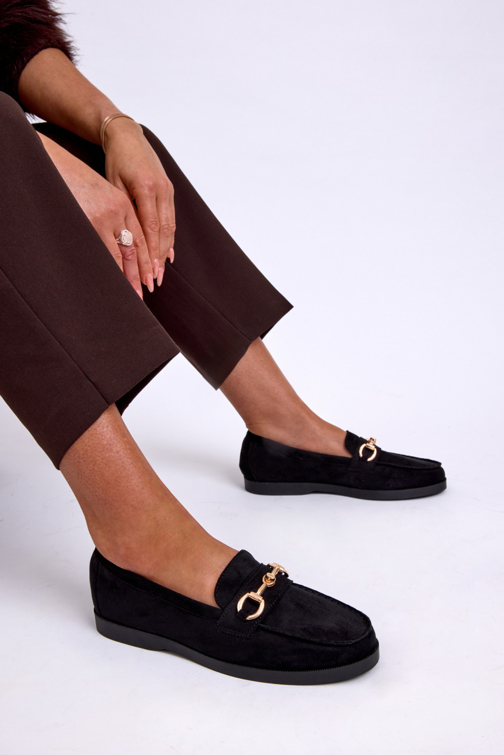 Women’s Black Faux Suede Loafers with Gold Chain Detail