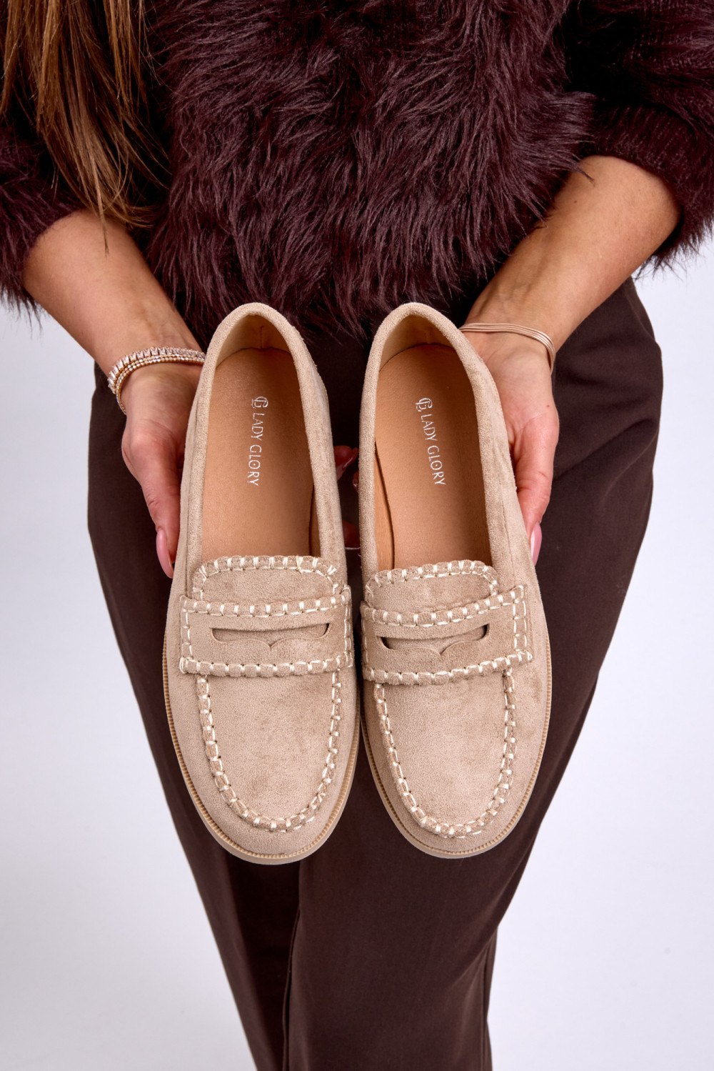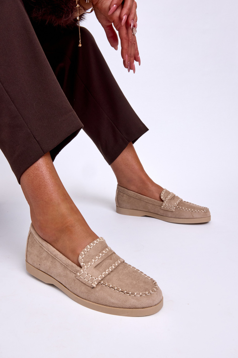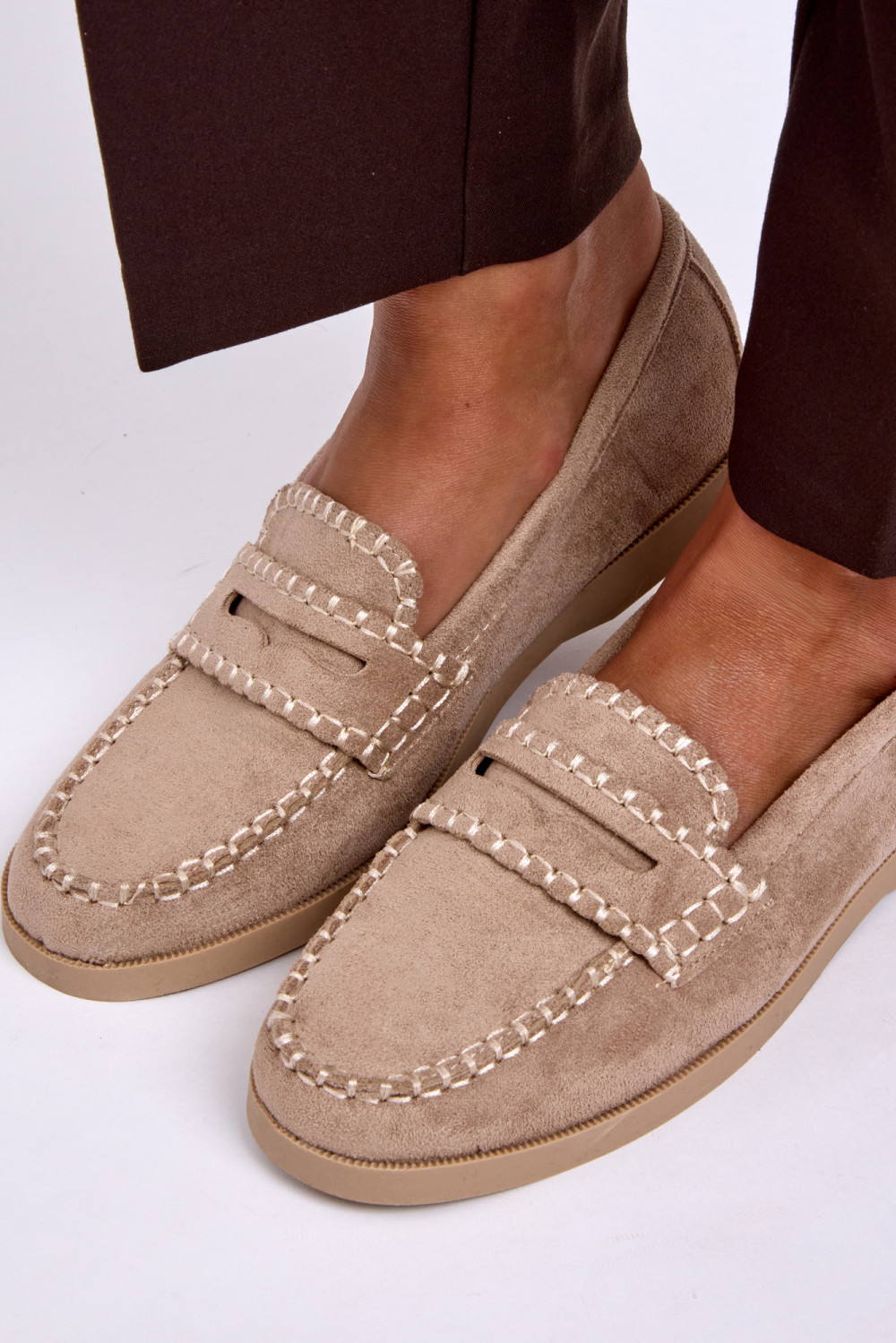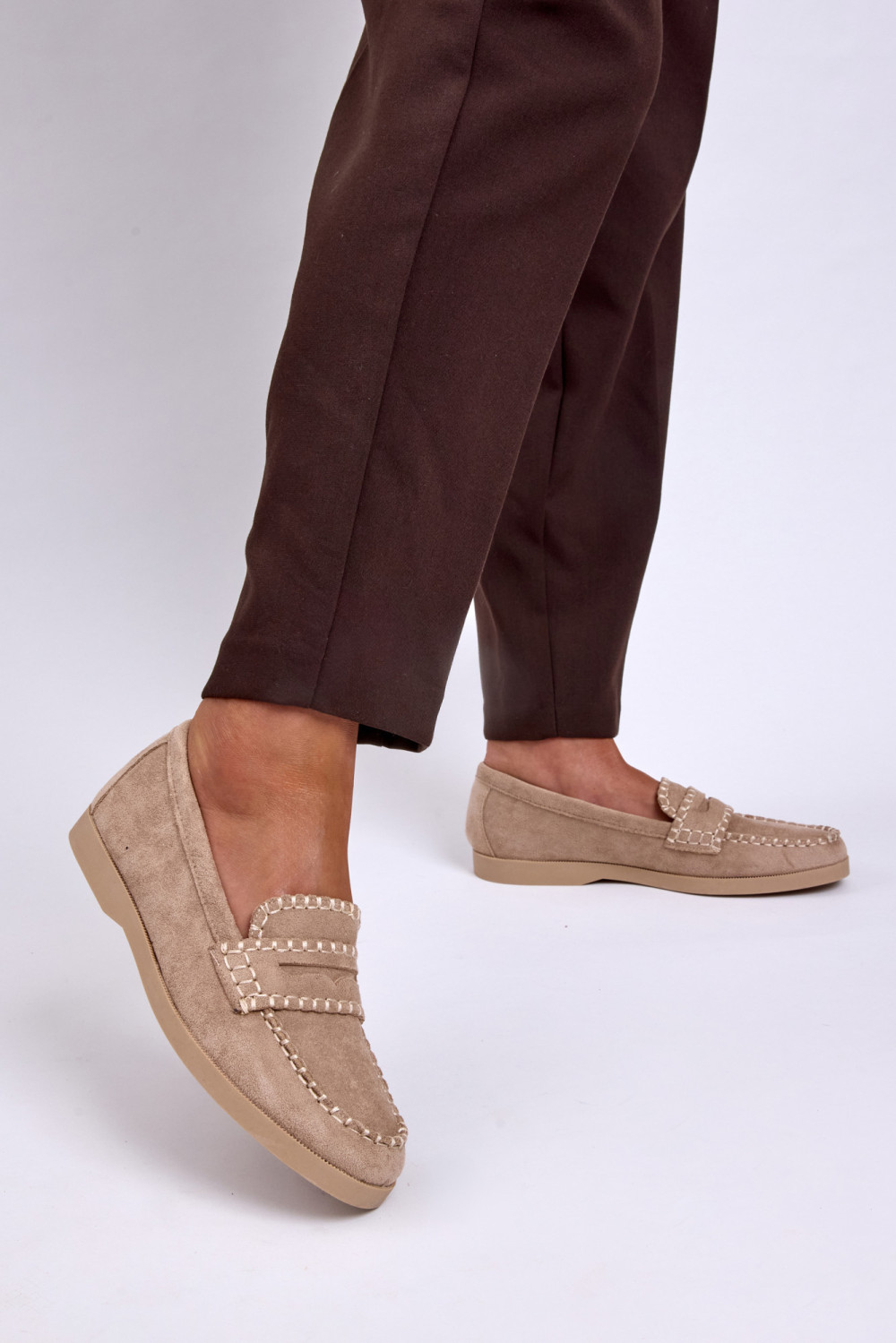 Upgrade your everyday wardrobe with these elegant women’s beige penny loafers crafted from soft faux suede. Designed for comfort and effortless styling, they feature a classic slip-on silhouette with decorative stitching and a timeless moccasin toe.