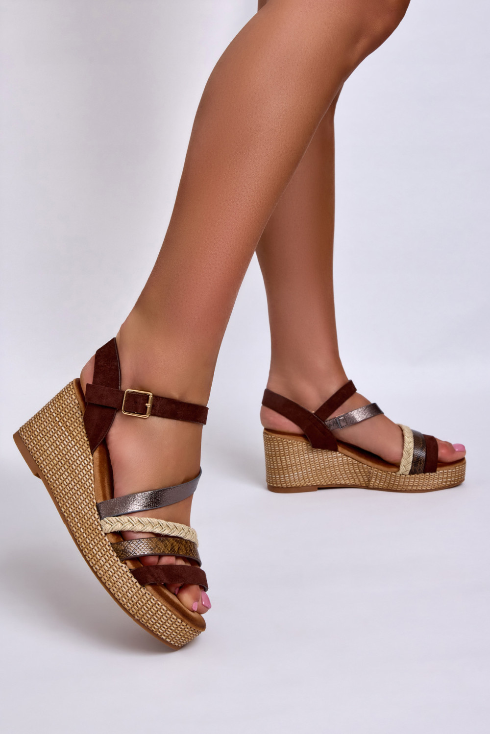 Designed for everyday wear, these brown multi-strap wedge sandals combine natural tones with reliable comfort. The woven raffia-effect wedge provides stable height while remaining lightweight, making them suitable for walking, shopping and daily summer use.