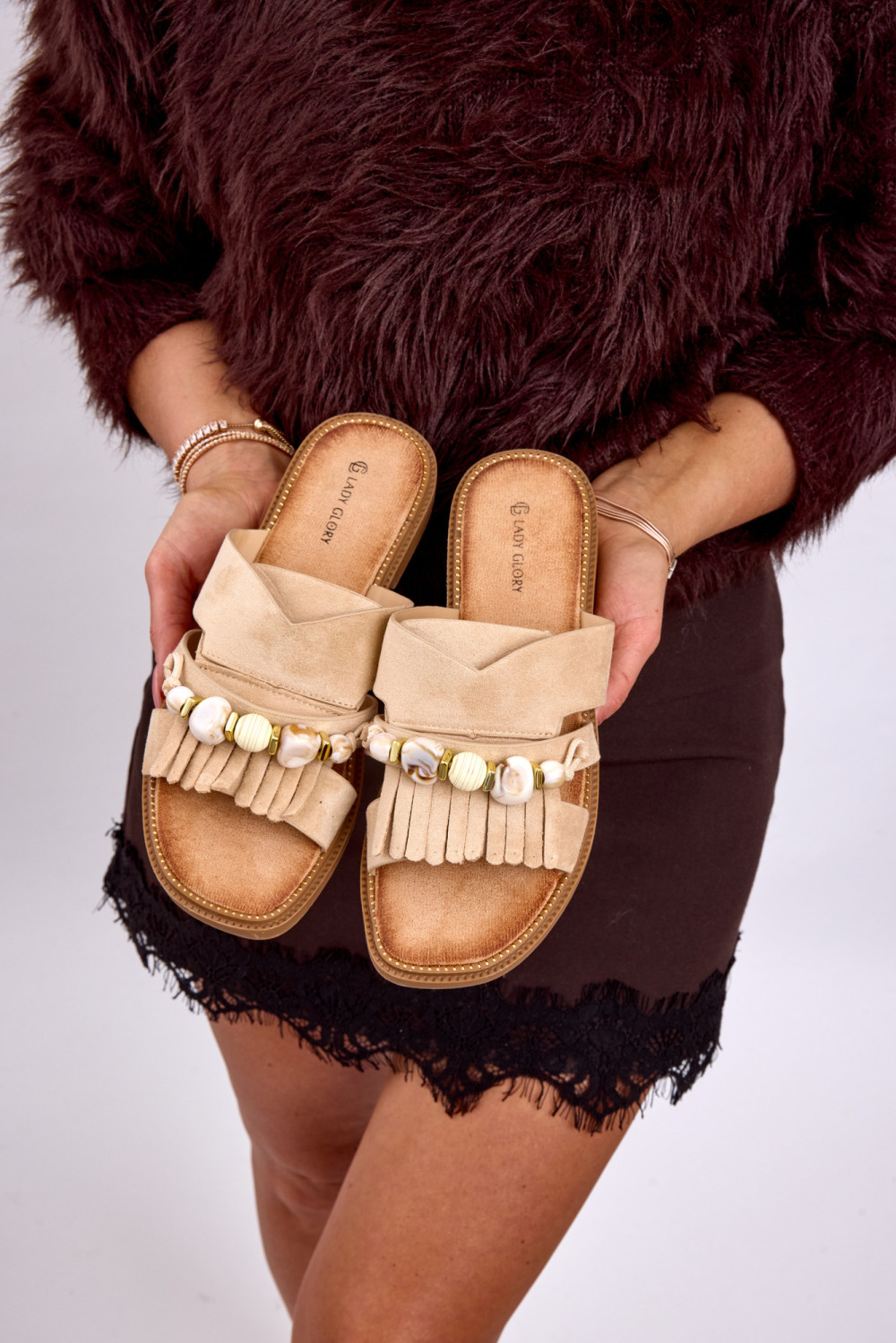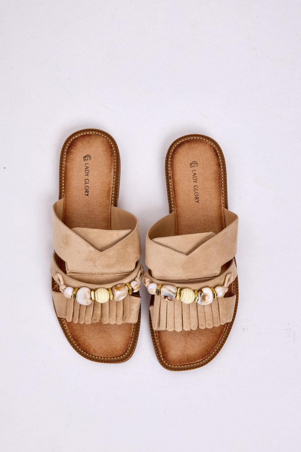 These beige flat sandals combine soft neutral styling with decorative detailing for a refined summer look. The upper features fringe accents and bead embellishments that add texture while maintaining a relaxed everyday feel. A cushioned insole supports comfort throughout the day, making them suitable for extended wear.
